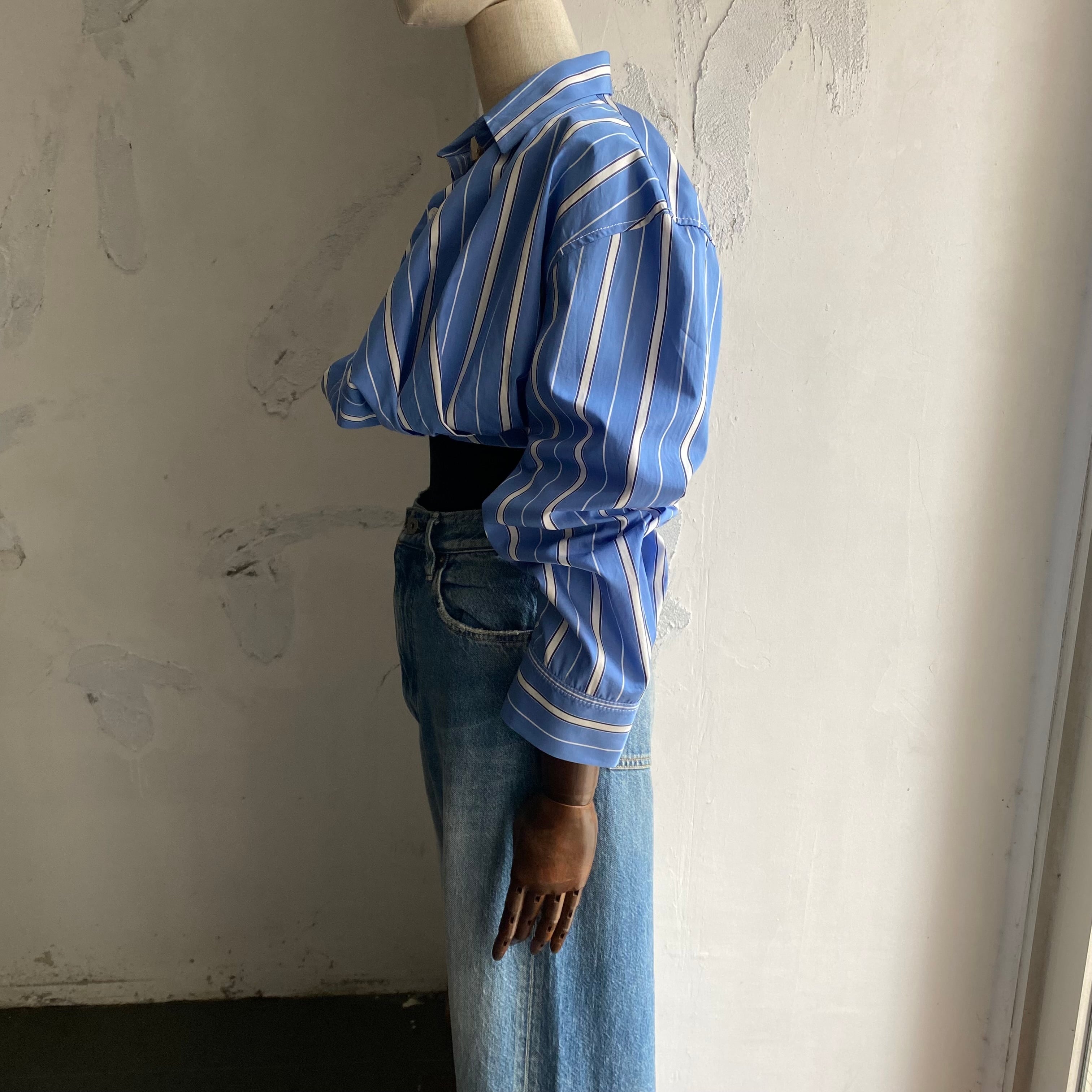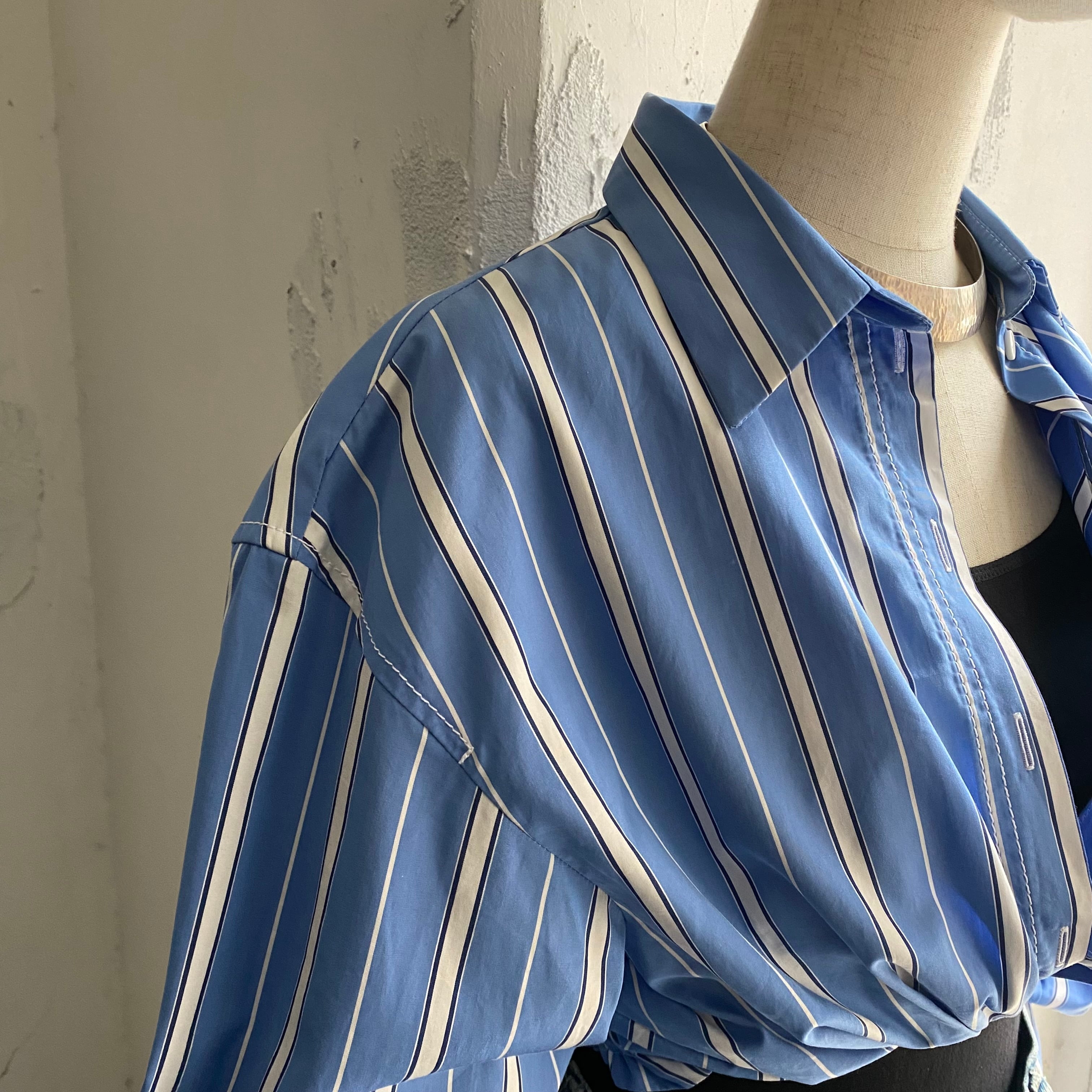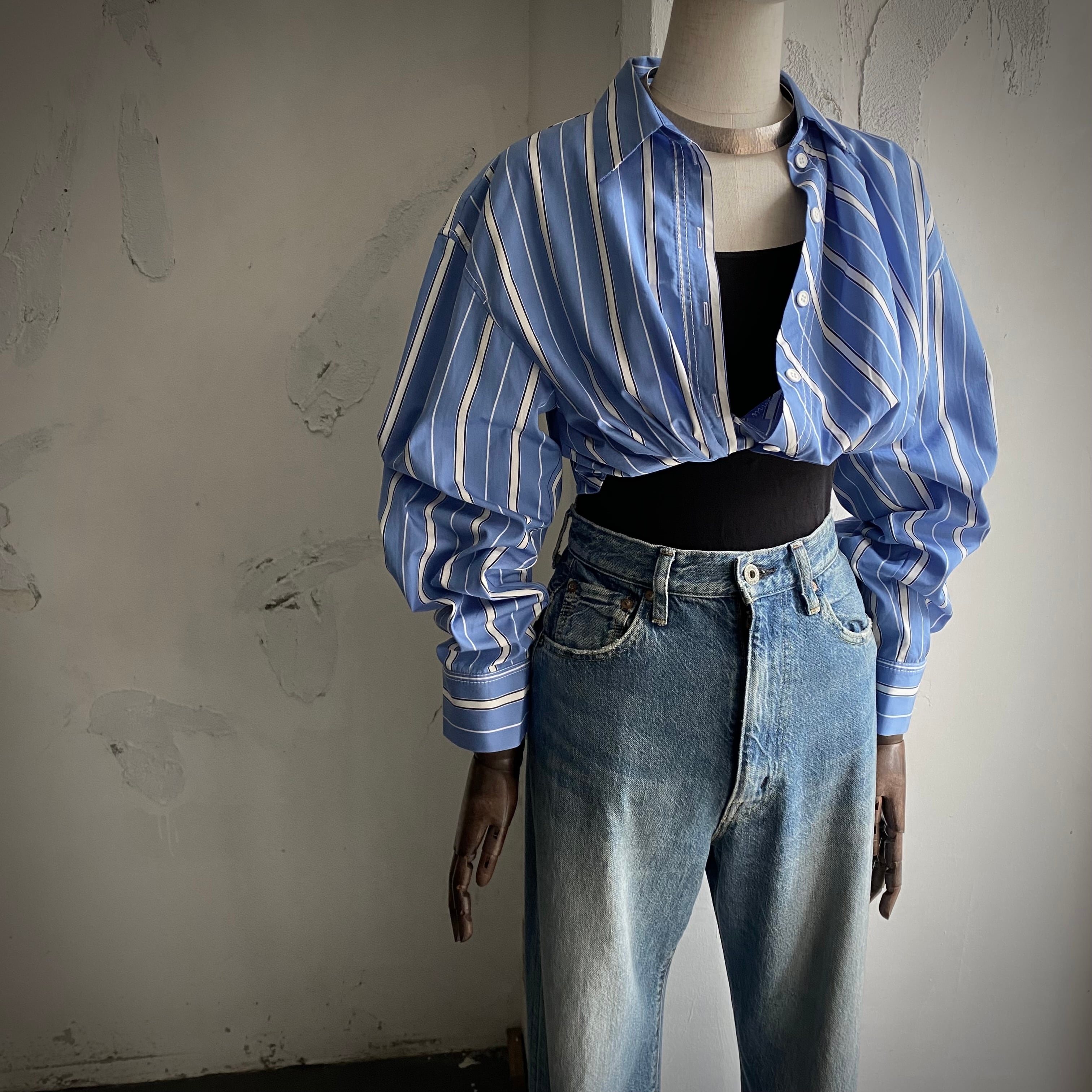 裾をストラップで上に吊るし、フロントをスナップボタンで留めるユニークなデザイン。フロントの裾を結び上げてボレロの様に着るスタイルをイメージした仕様です。