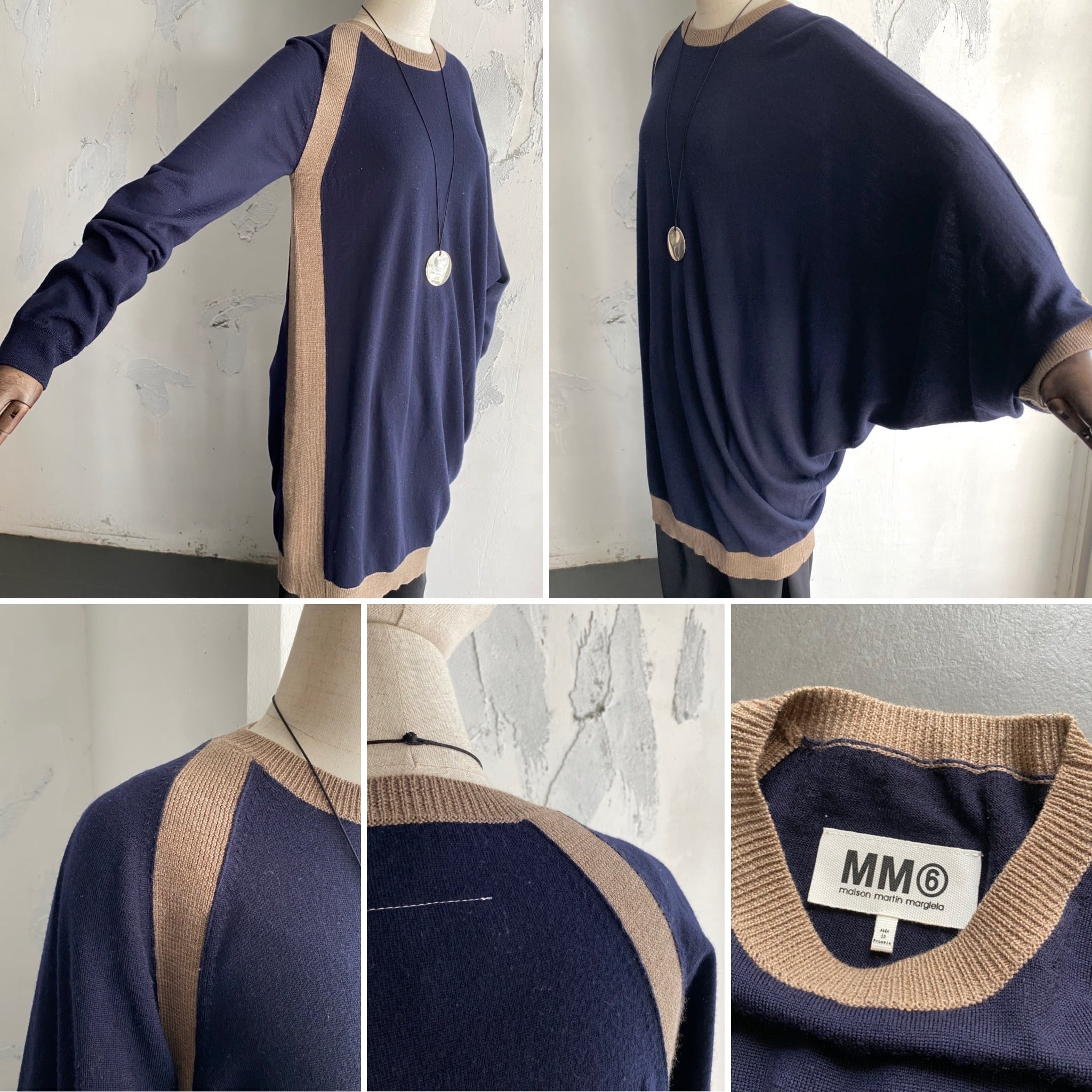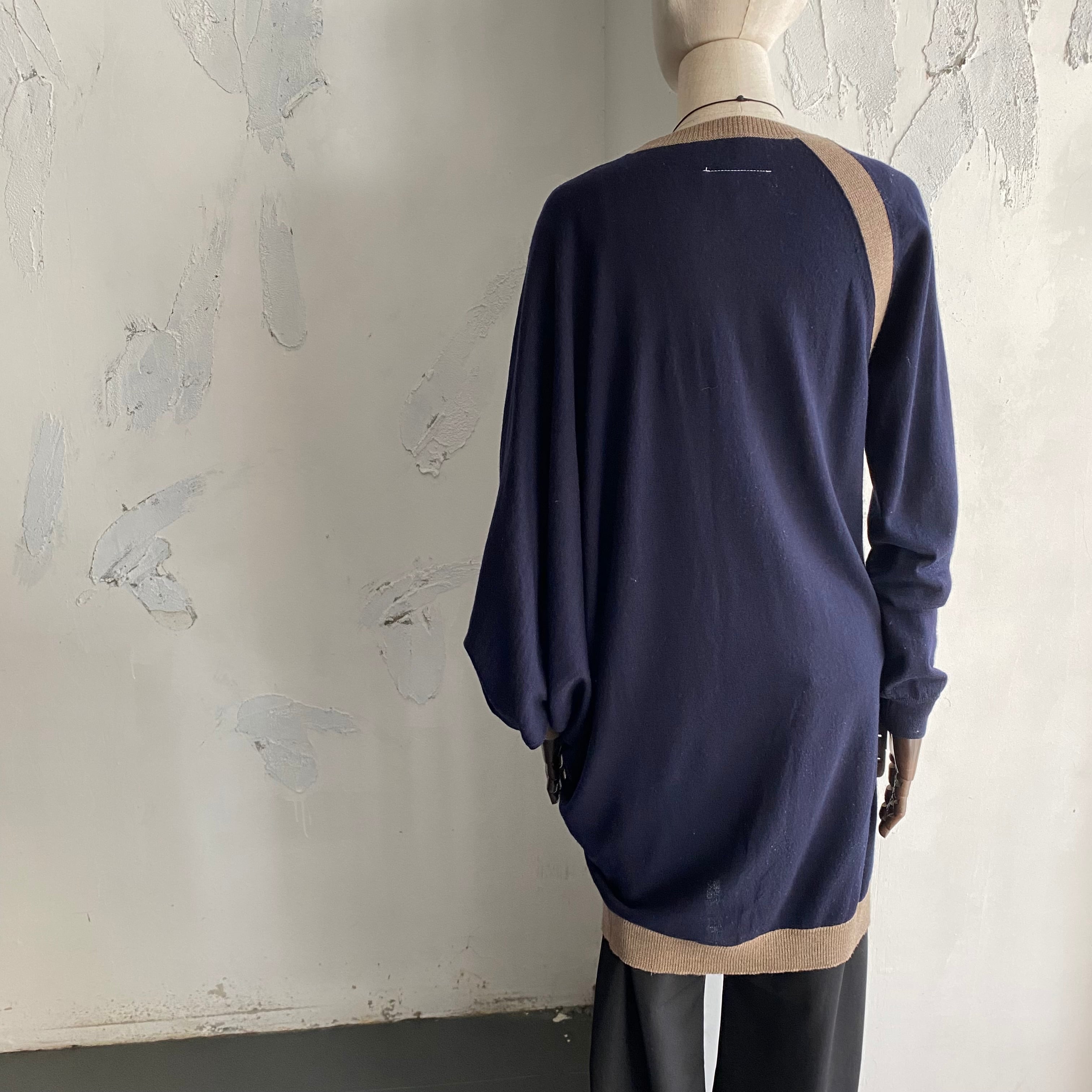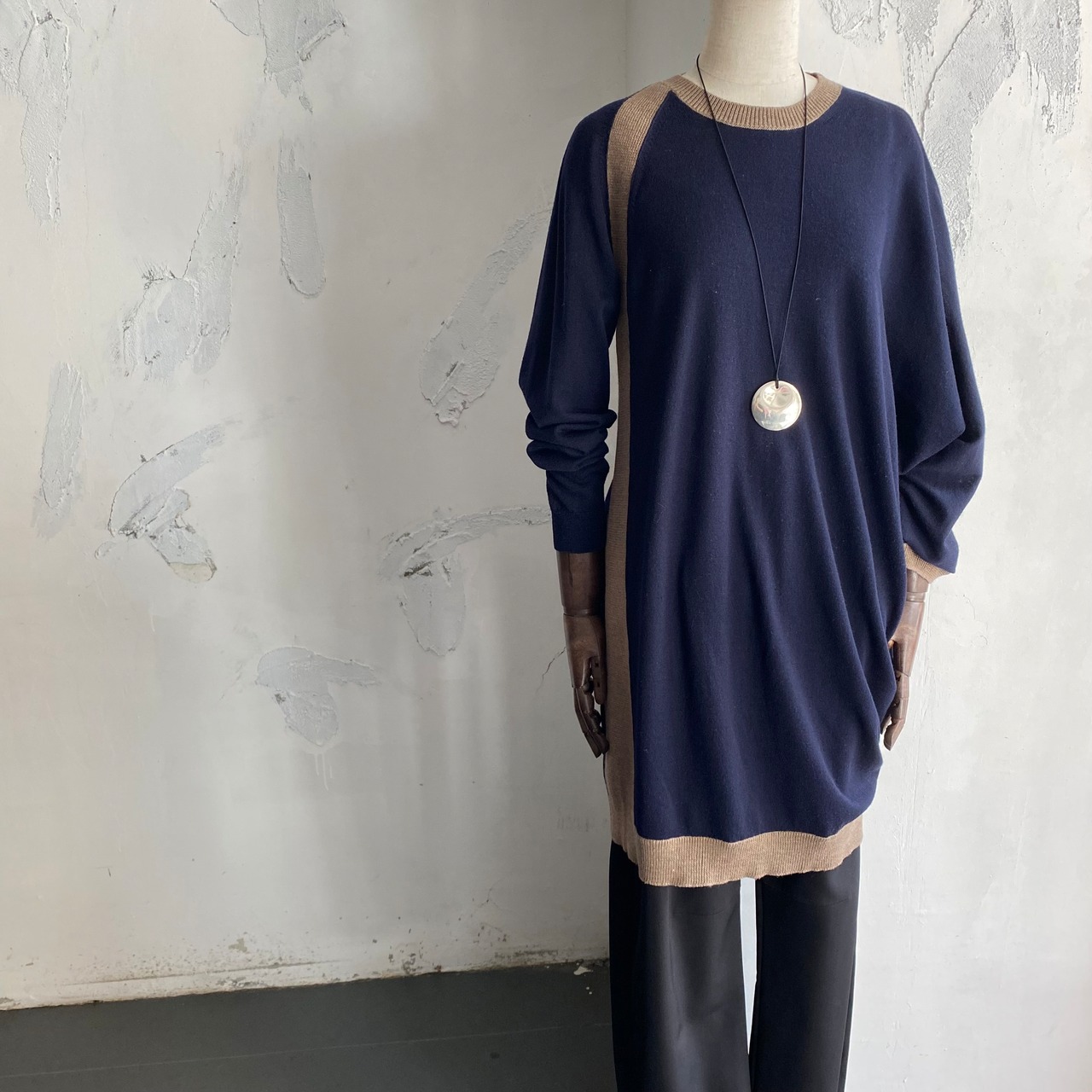 ネイビーのハイゲージニットにベージュのリブ、左だけドルマンスリーブのアシンメトリーデザイン。