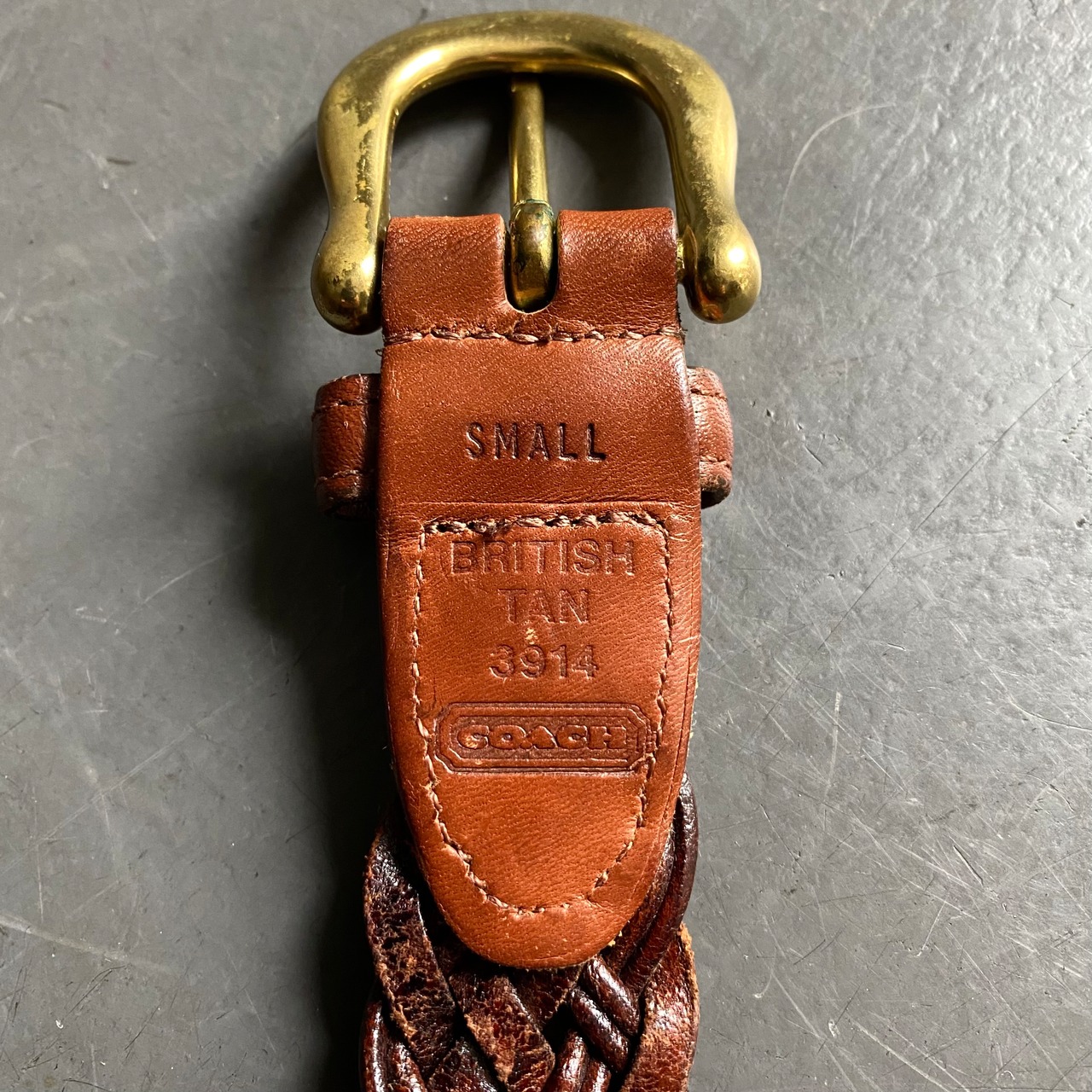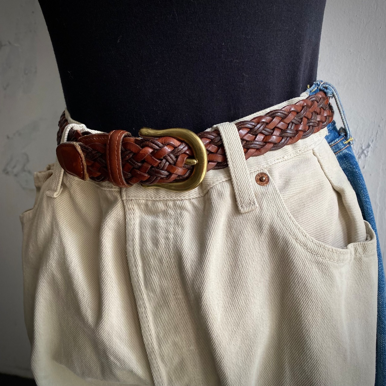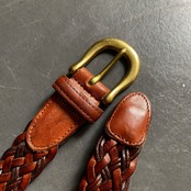 アンティークゴールドのバックルに2色のブラウンレザーを編み上げたベルト。