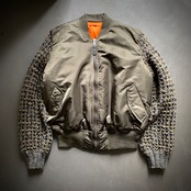 アルファインダストリーズのMA-1を再構築したジャケット。袖を、グレーベースに多色のツブツブを入れたローゲージニットに付け替えたデザイン。