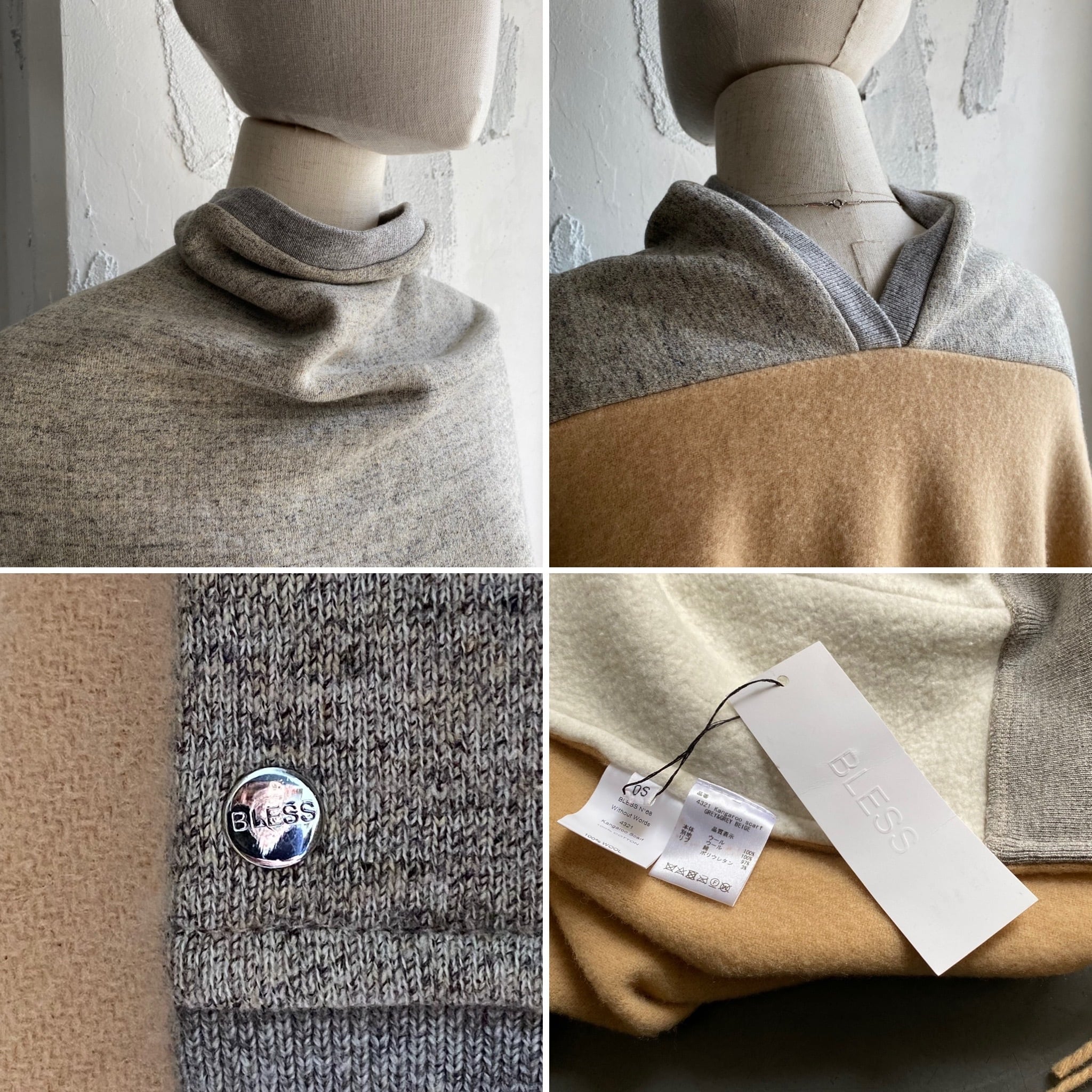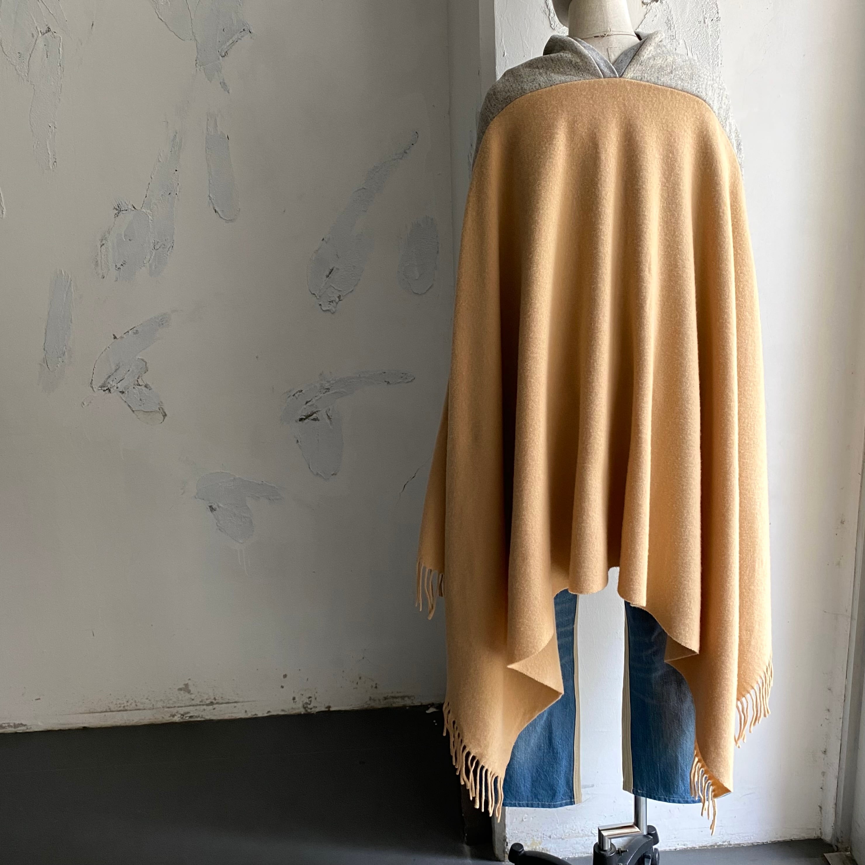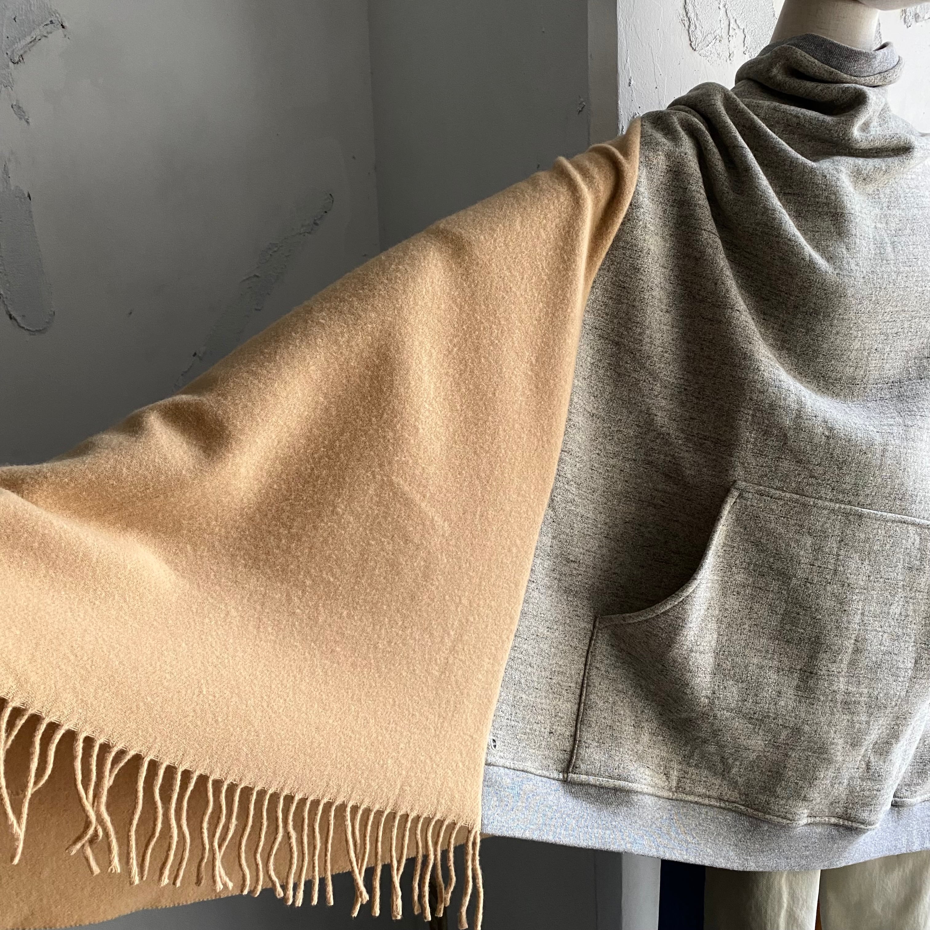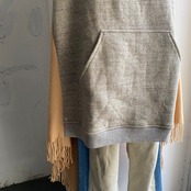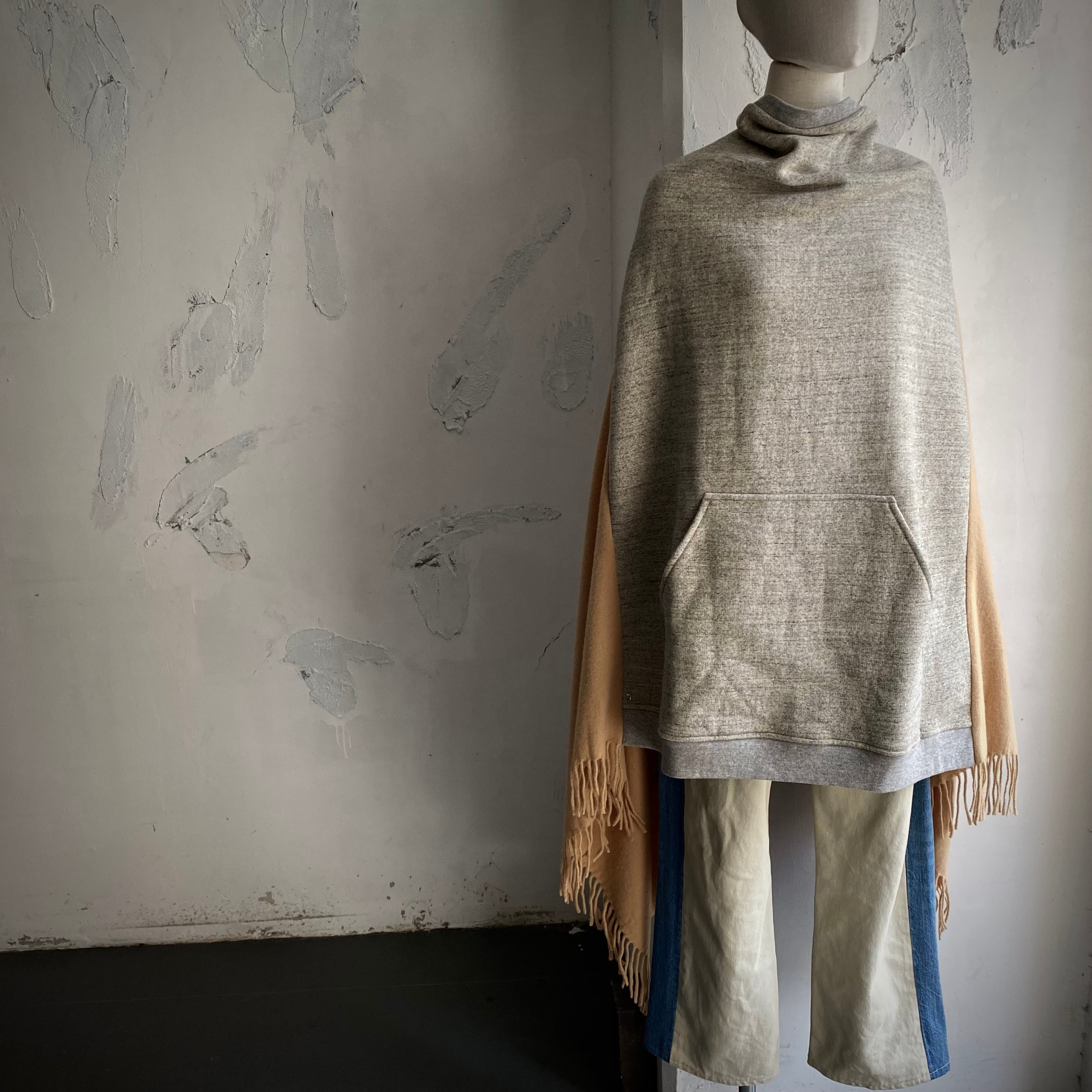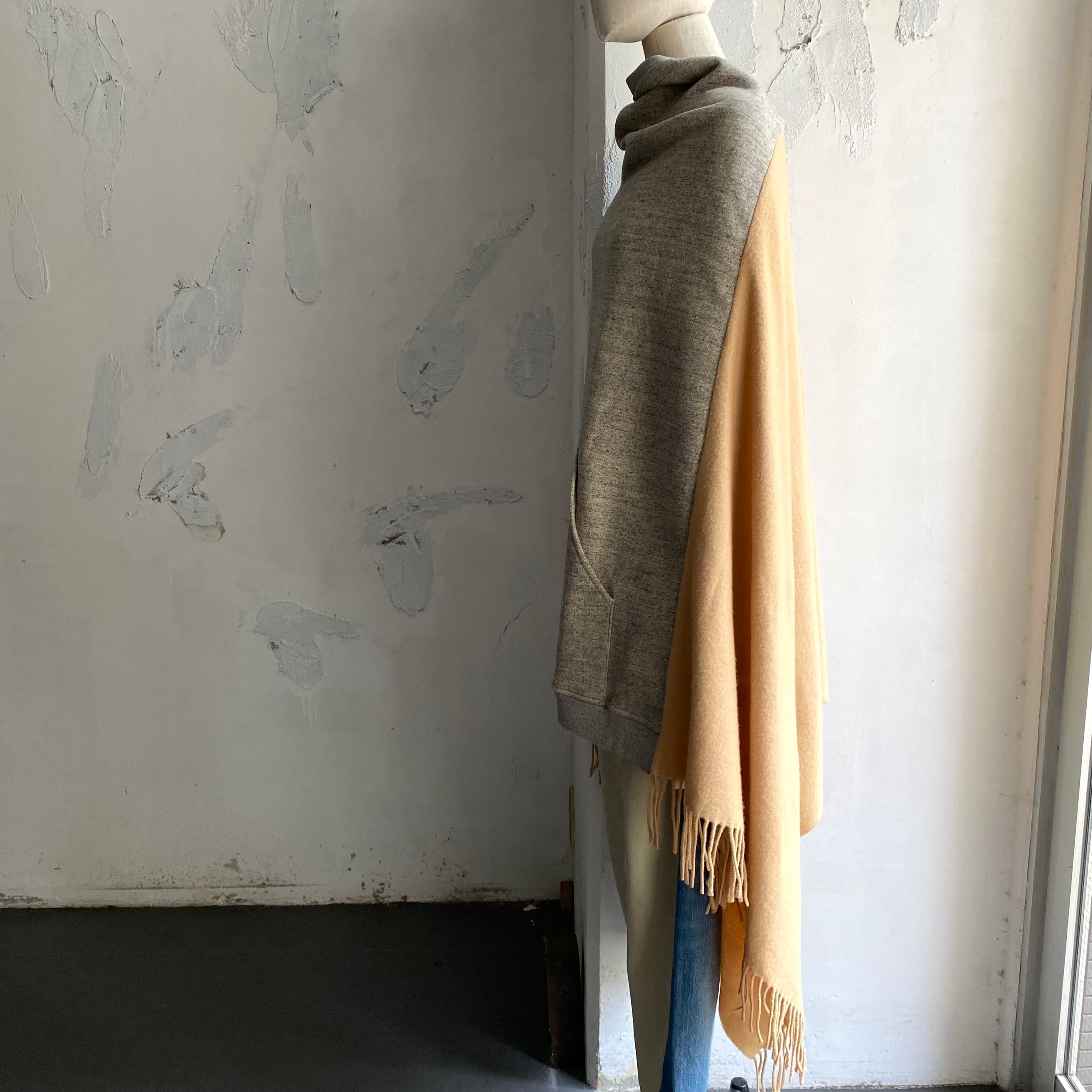 カンガルーポケット付きのスエットとベージュウールのストールをドッキングしたポンチョ。