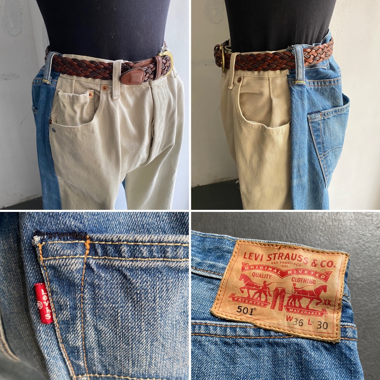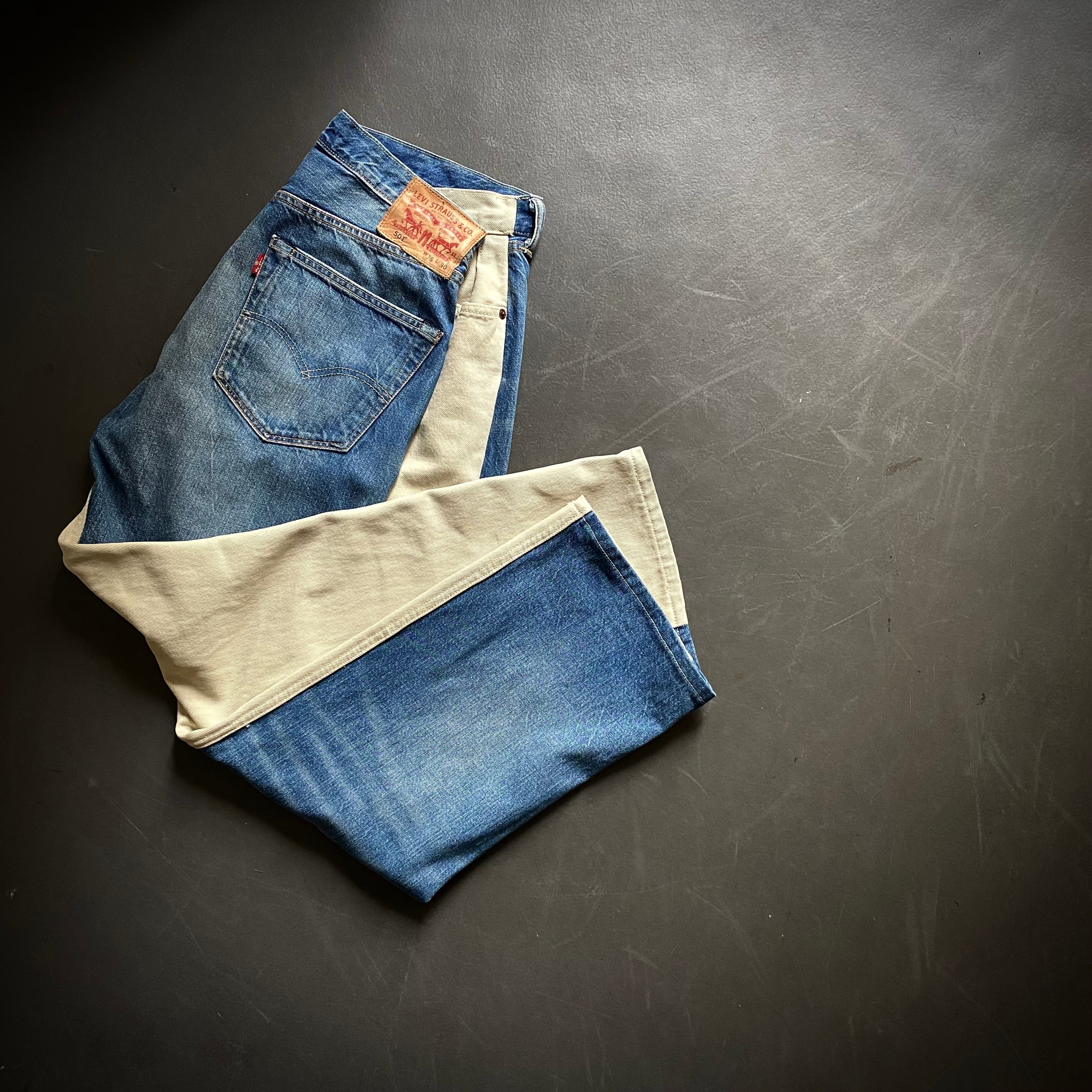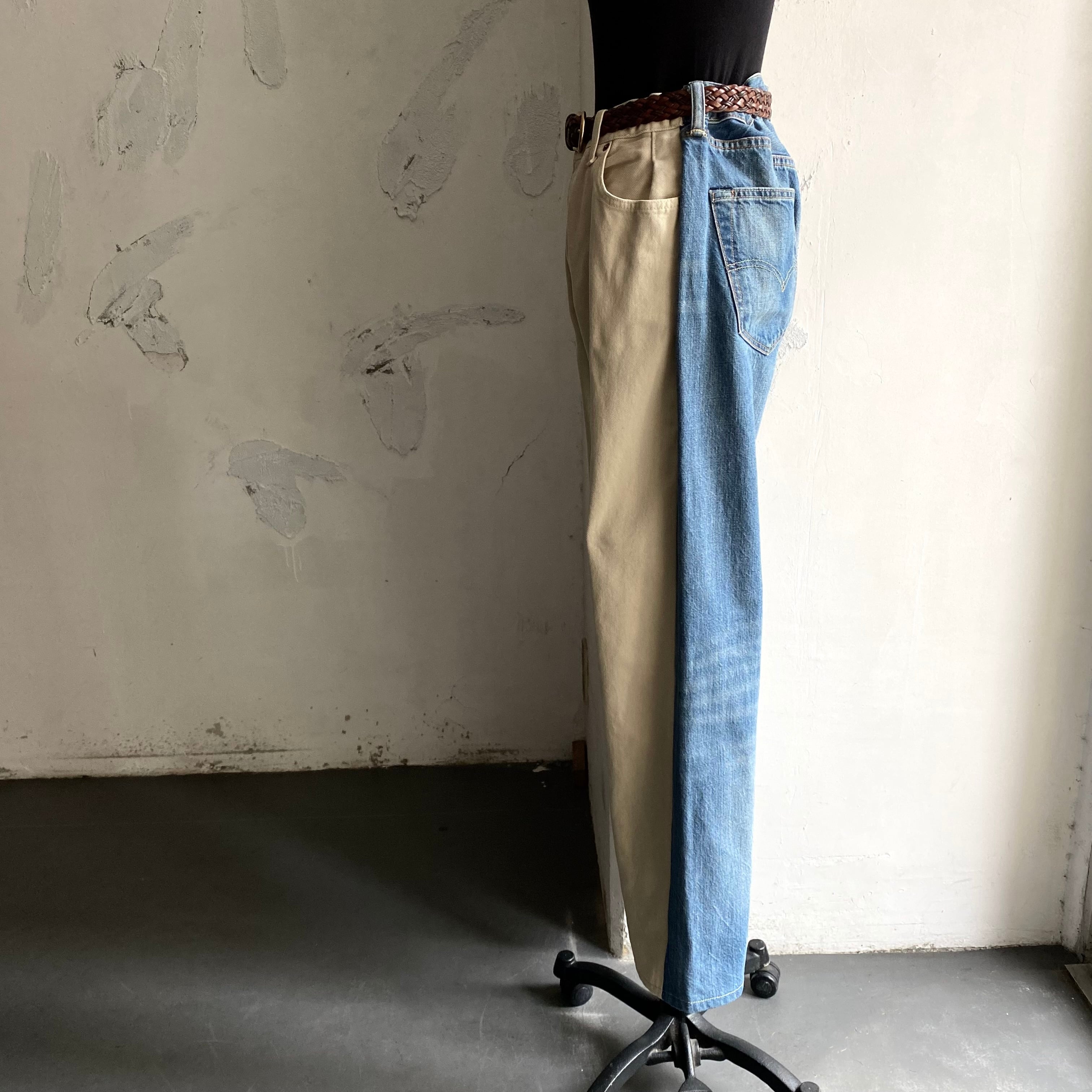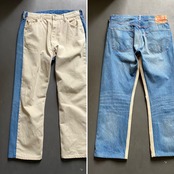 BLESSの定番でもあるLevi’s501を使ったドッキングデザインのリメイクパンツ。前をアイボリーのカツラギに切り替え、やや後ろ面を大きく取り立体感を演出しています。