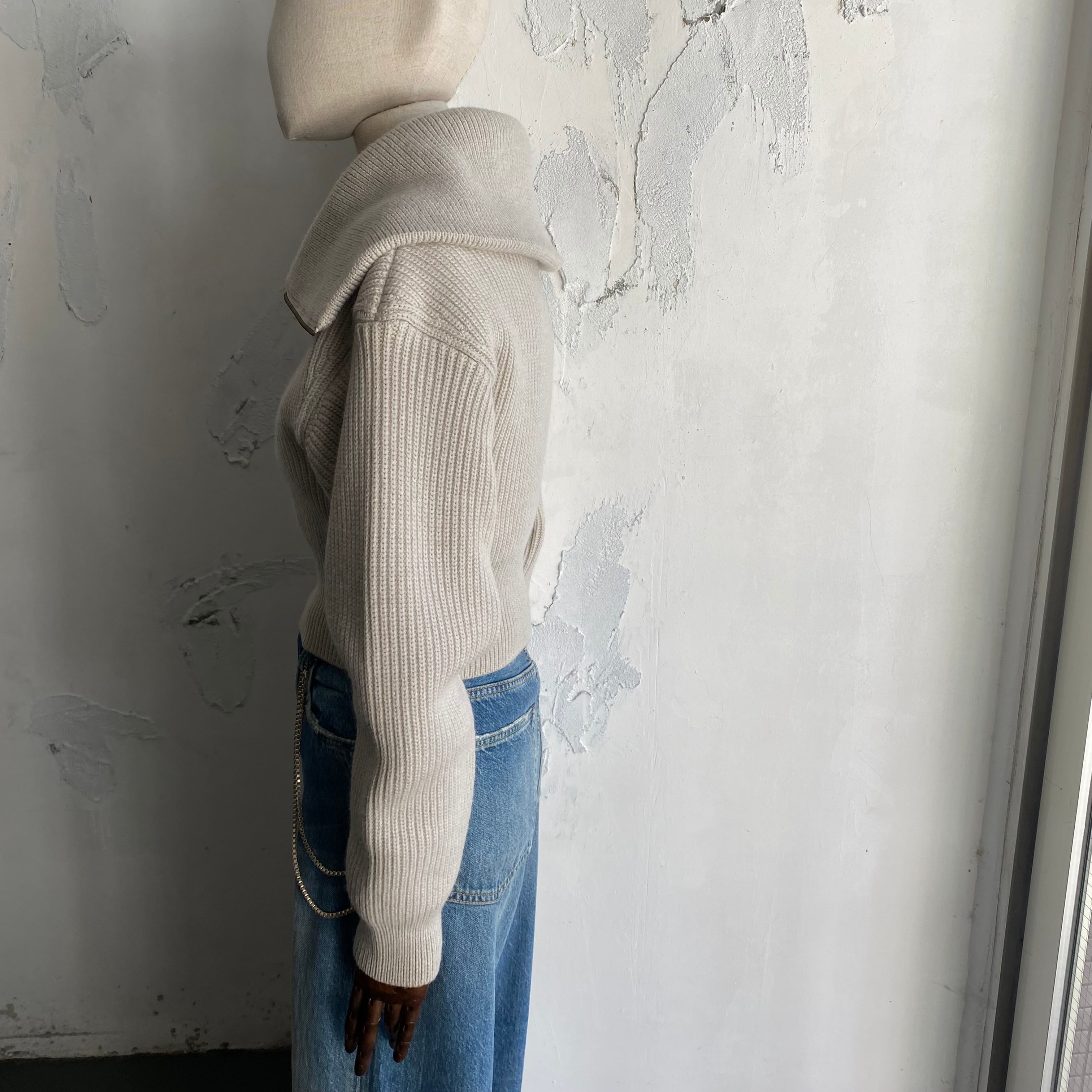 ライトグレーの地厚なリブニットを使い、ショート丈とハーフジップのボリュームカラーが特徴のセーター。中には共地のミドルゲージニットがレイヤーされています。