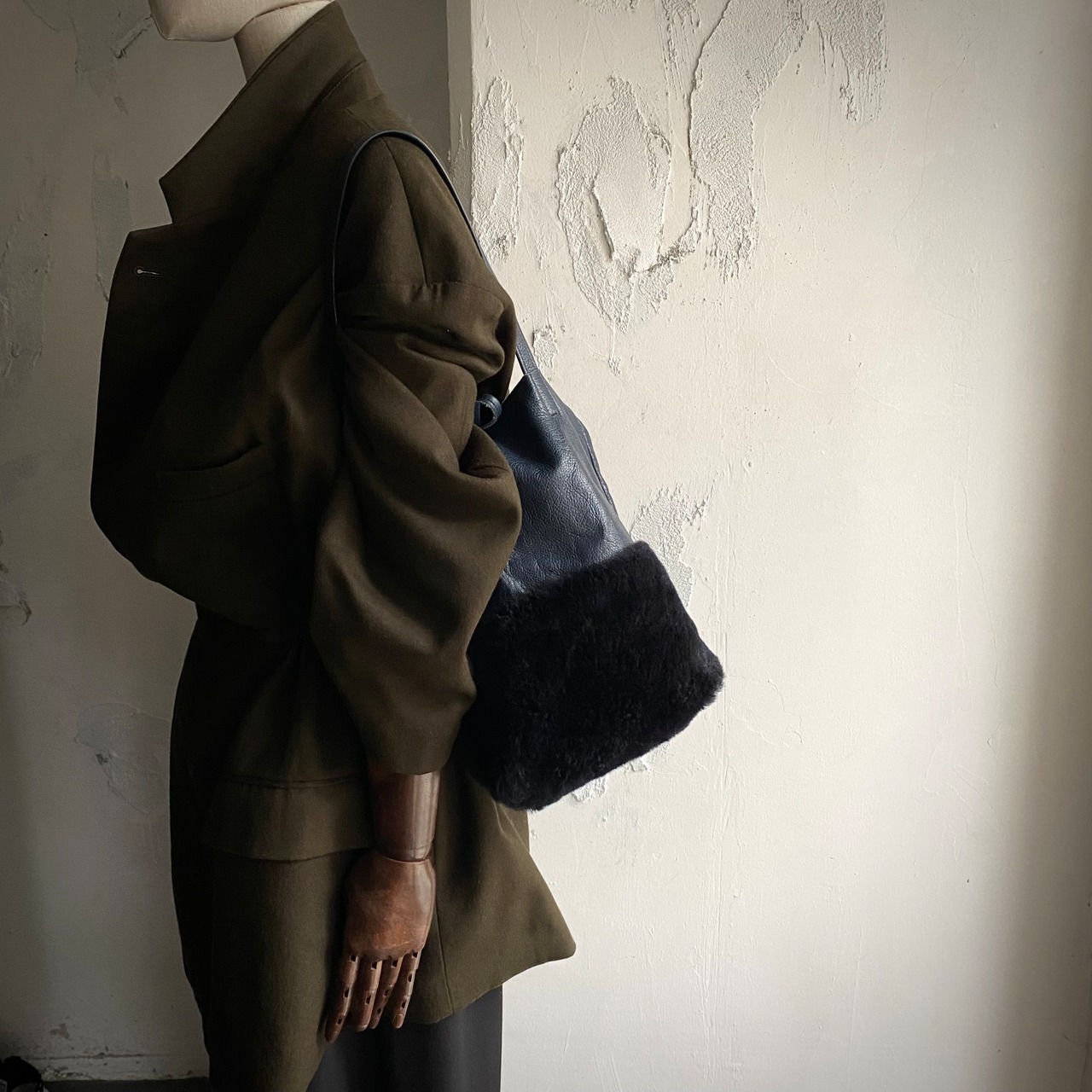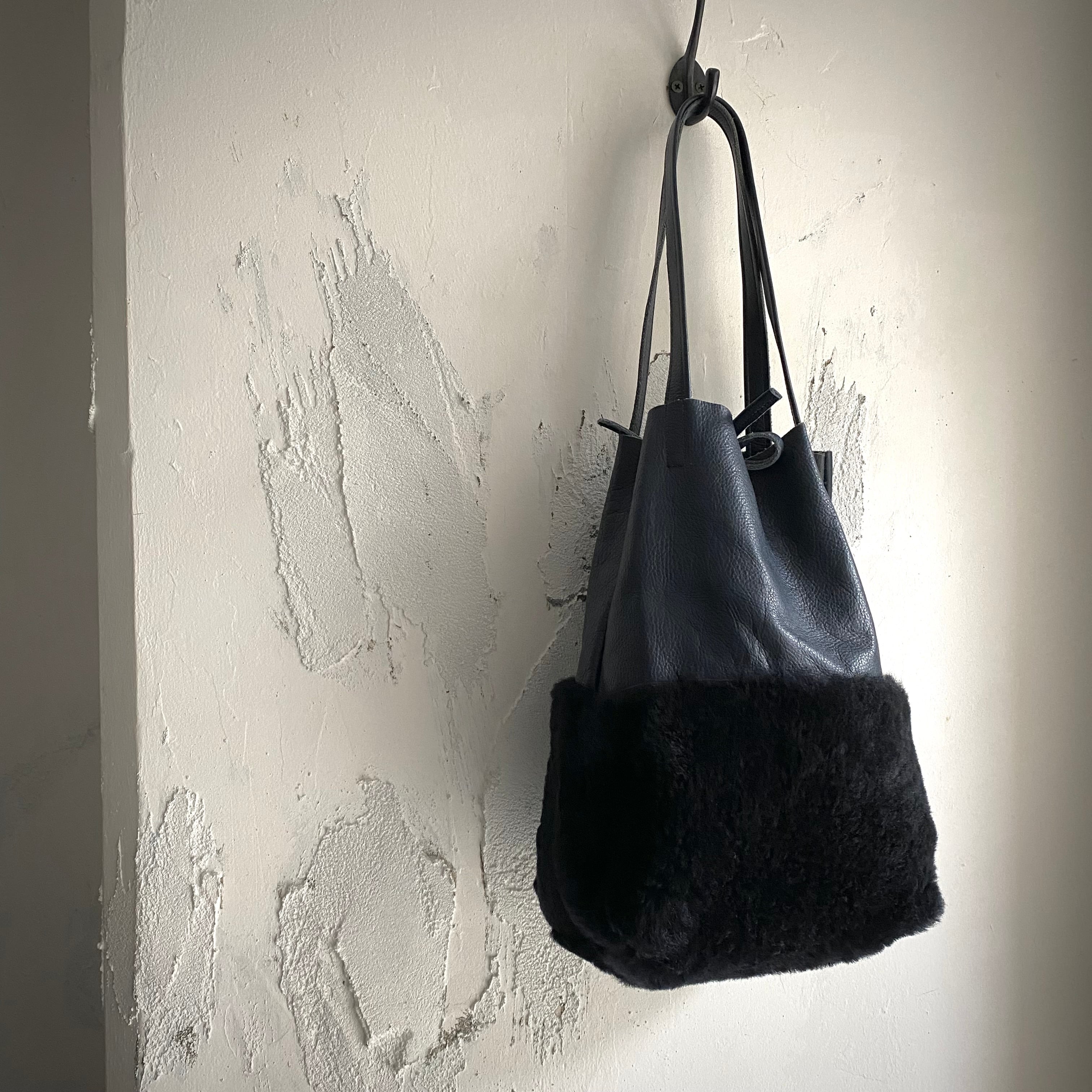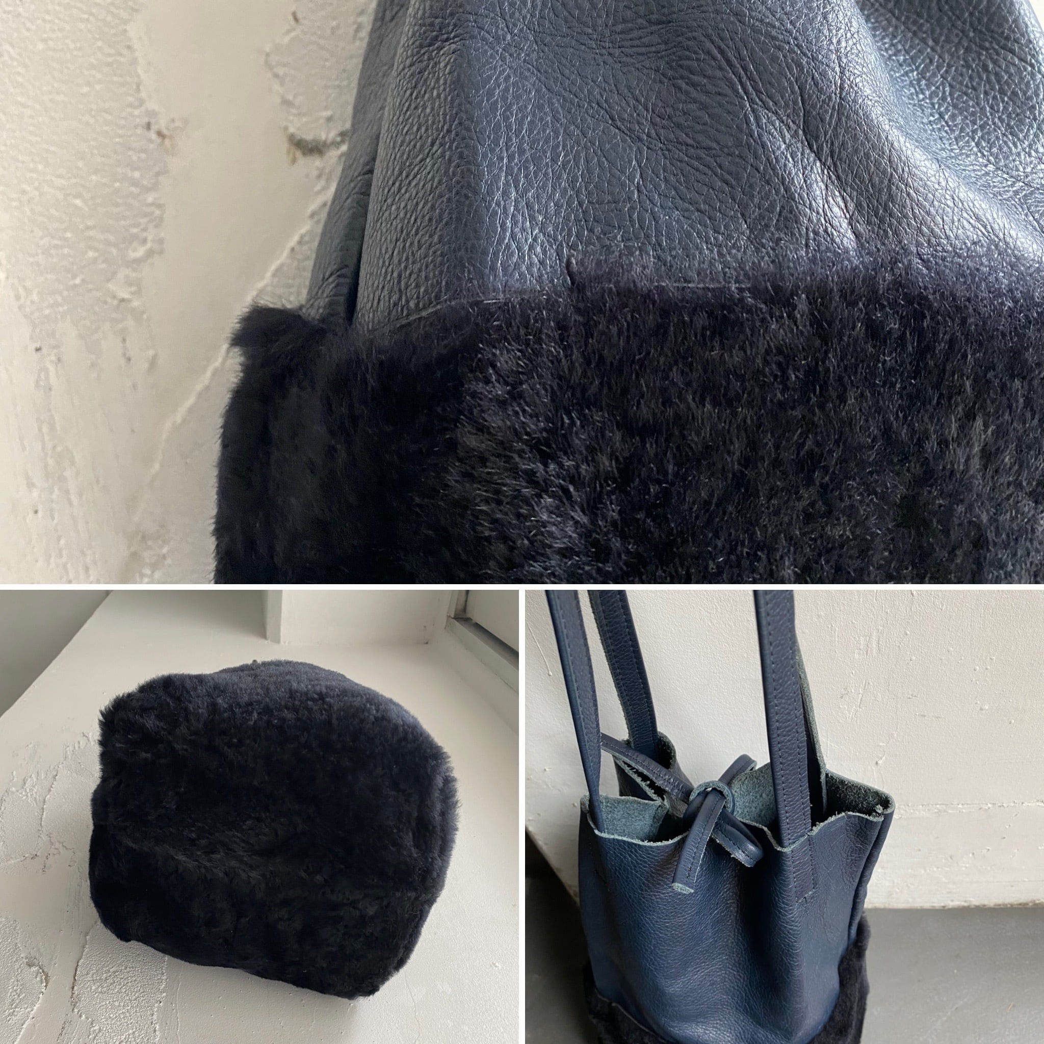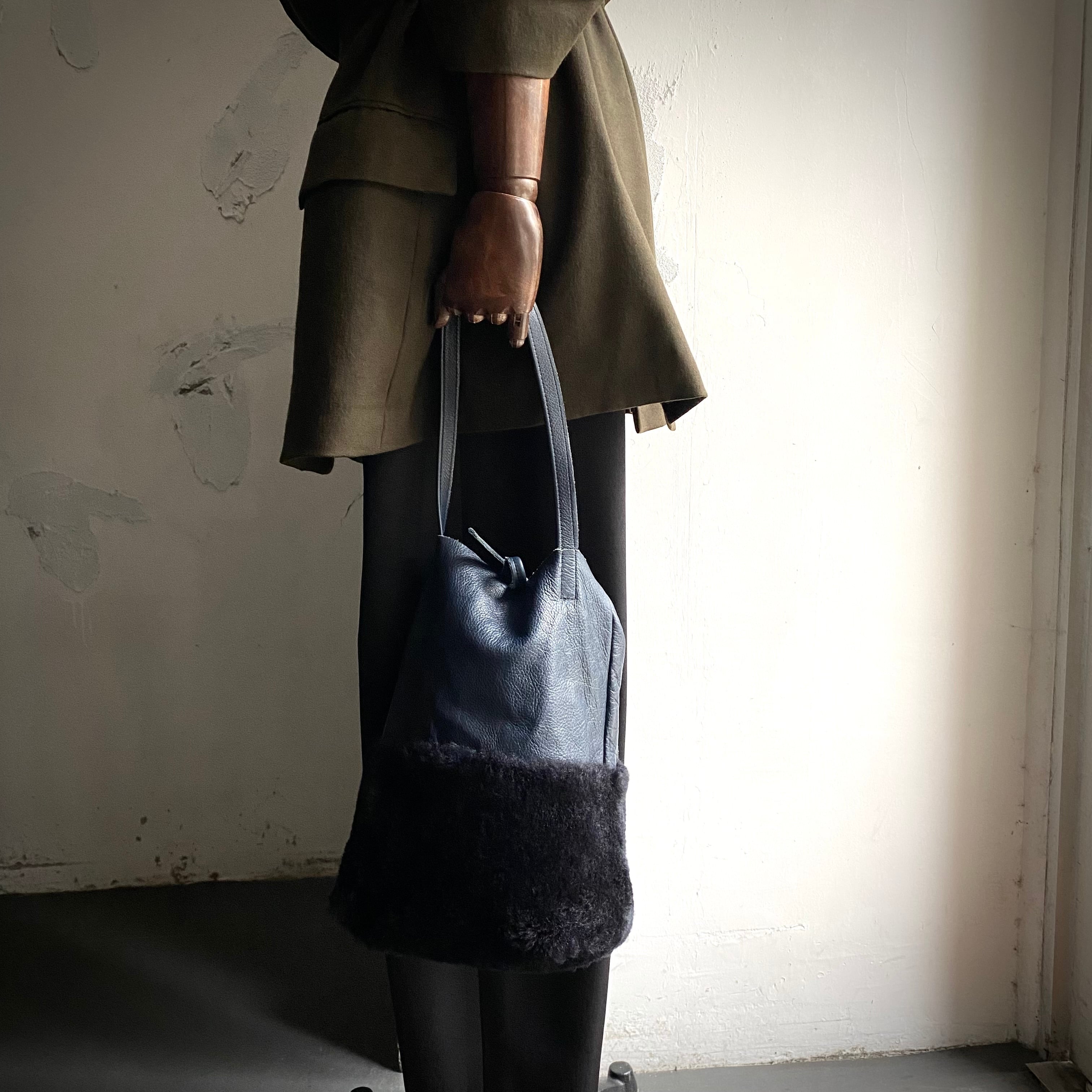 ネイビーの牛革をベースに下半分をブラックムートンに切り替えたミニトートタイプのバッグ。