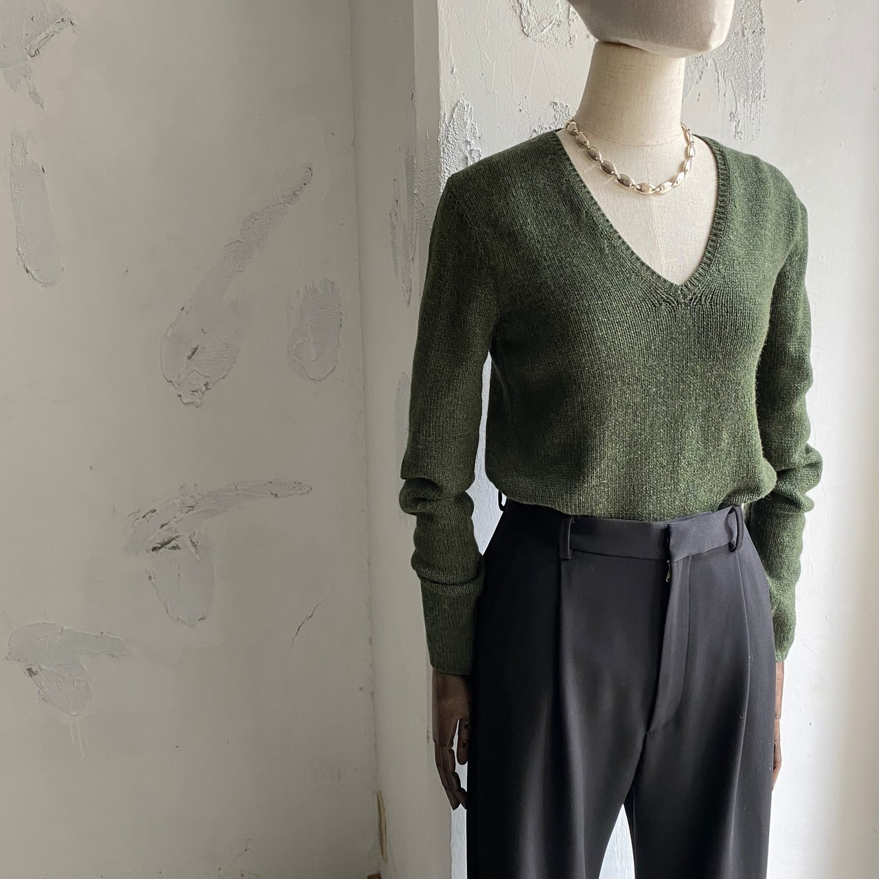 ふわふわなカシミアを使ったシンプルなセーター。開きのあるVネックが女性らしさを演出しています。