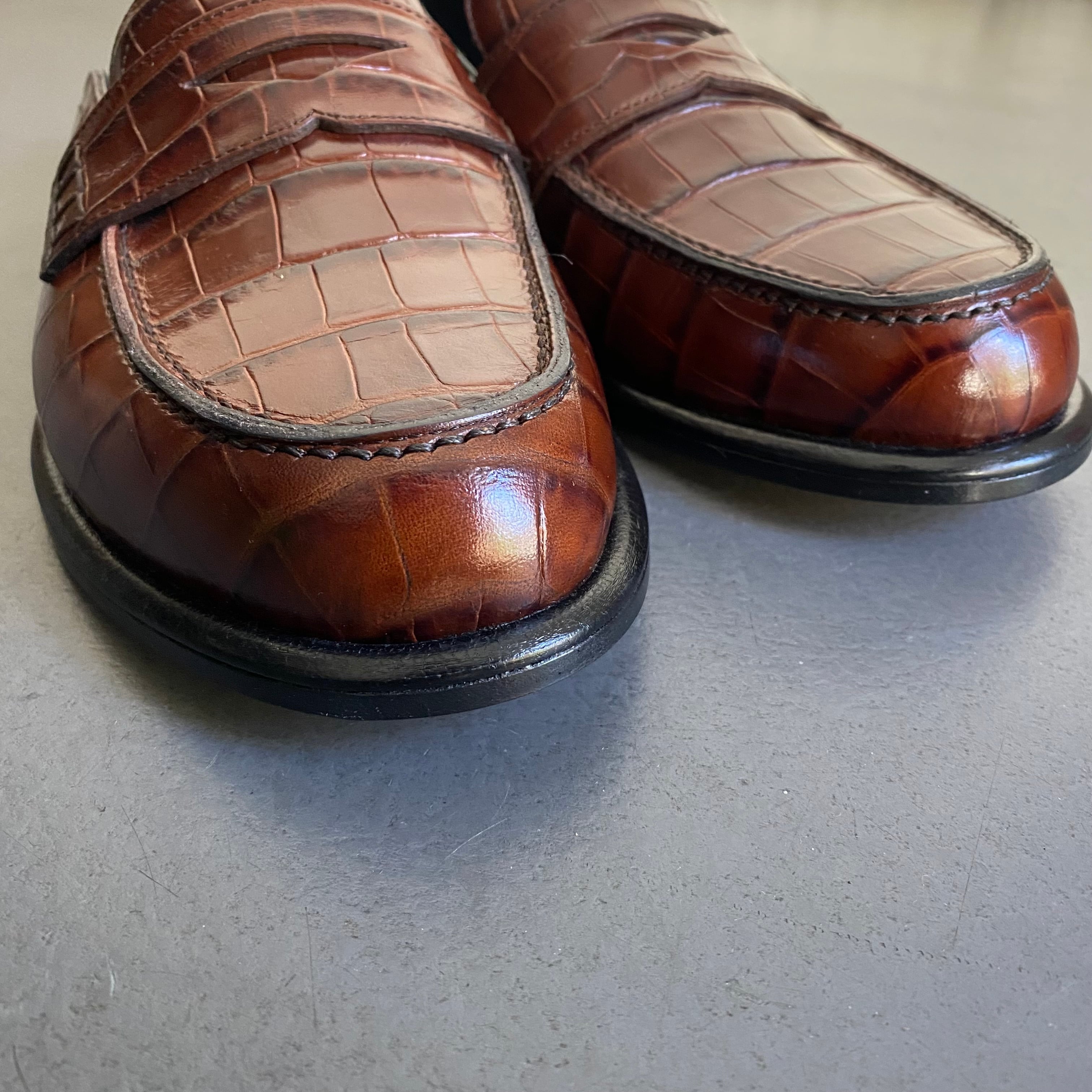 型押しクロコのアッパーとブラックディアスキンのヒールのコンビデザイン。