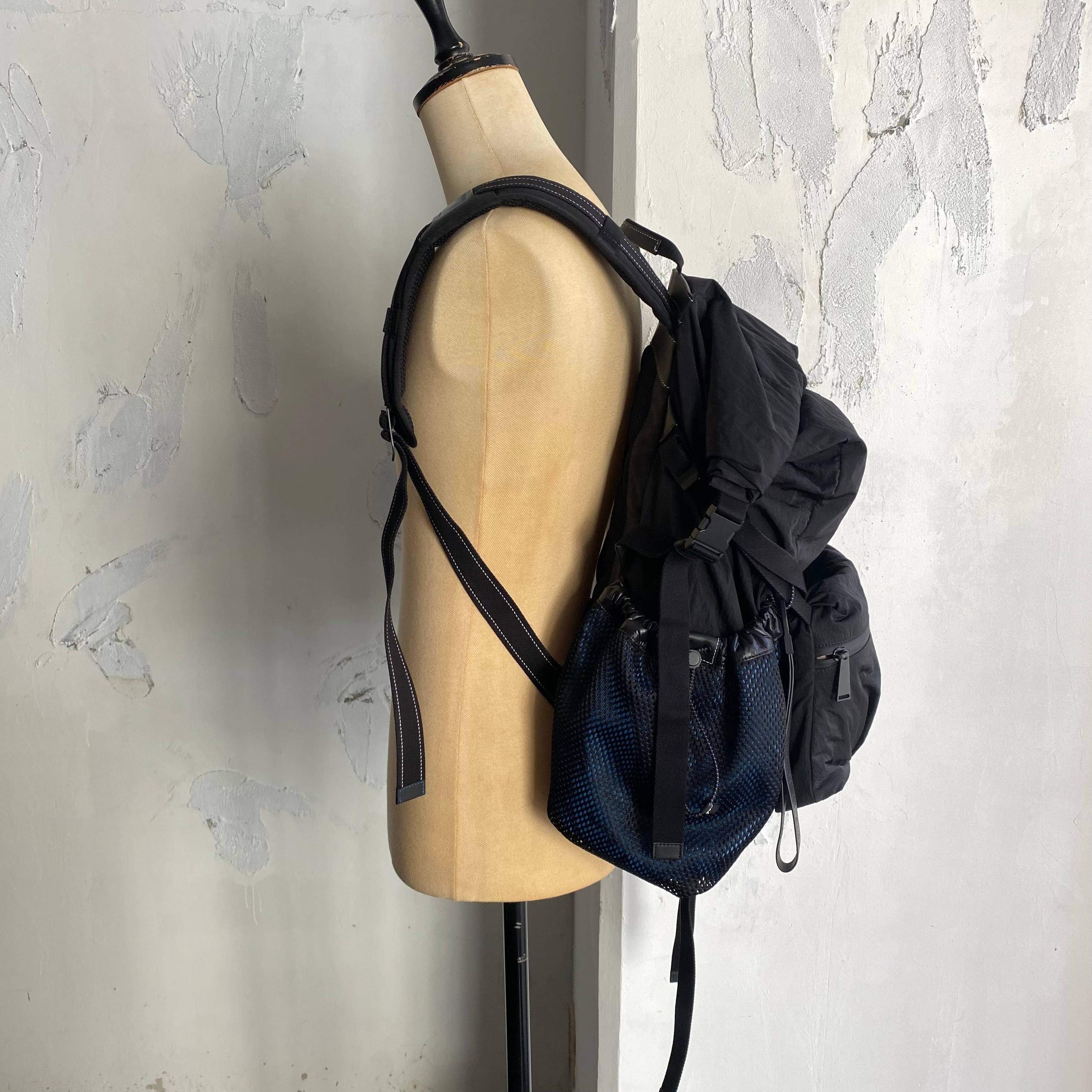 軽量のペーパーナイロンを使い、外ポケット3つでセンターのジップポケットは脱着式で単独ポーチにもなります。ロールトップの大容量サイズで、グレイッシュブラックのシェルにシャイニーブルーのリップストップナイロンのライニング。インサイドとバックにもポケットがあり実用度な高いプロダクトです。