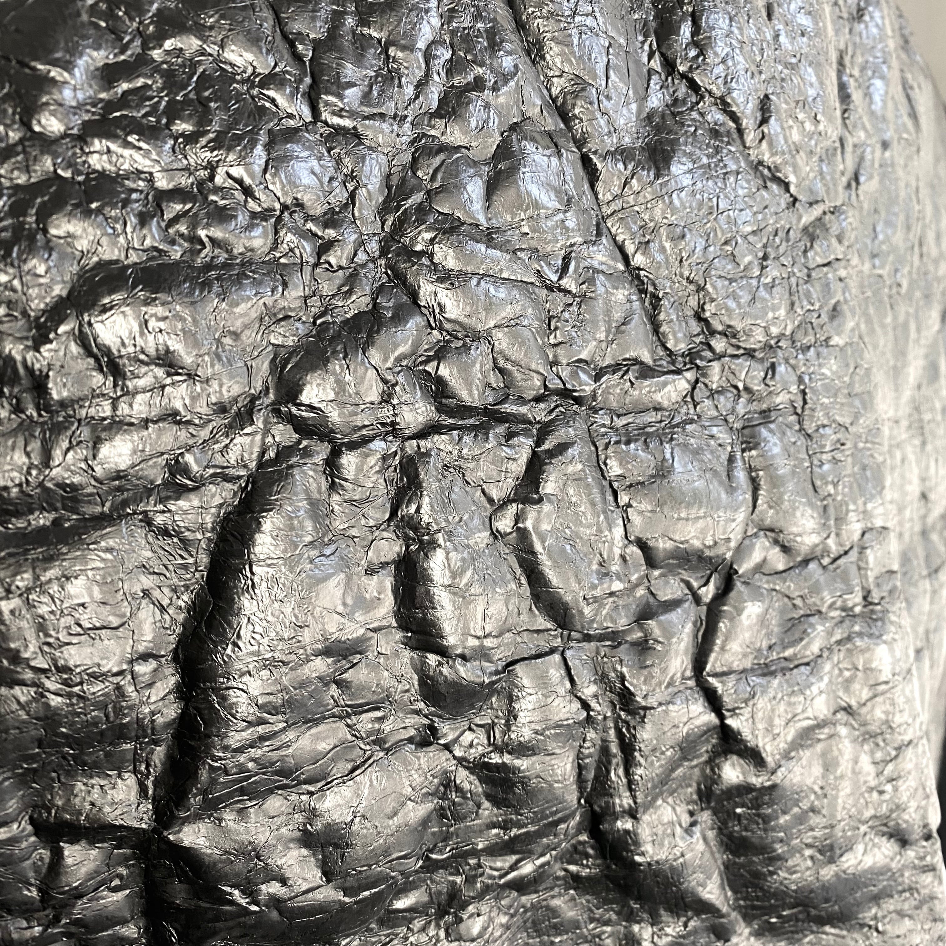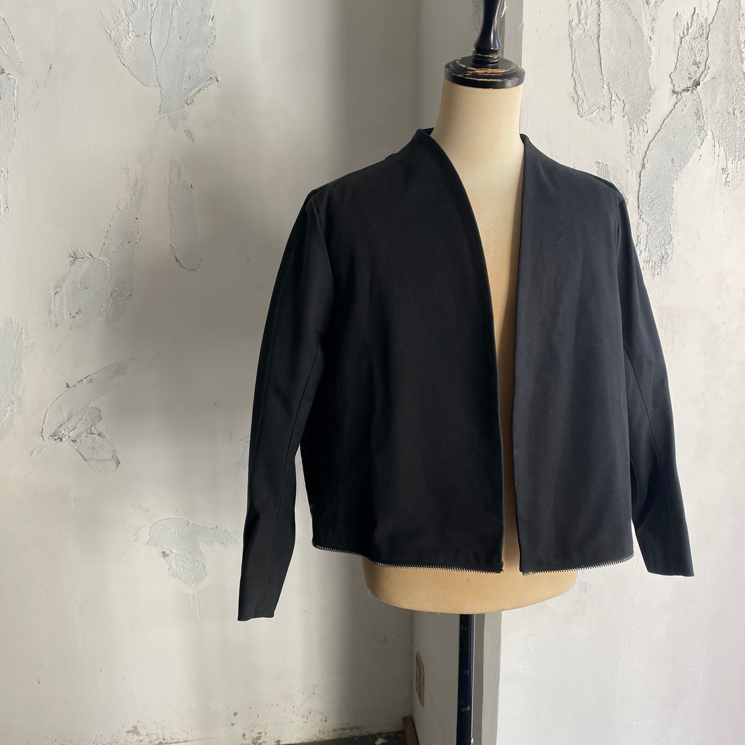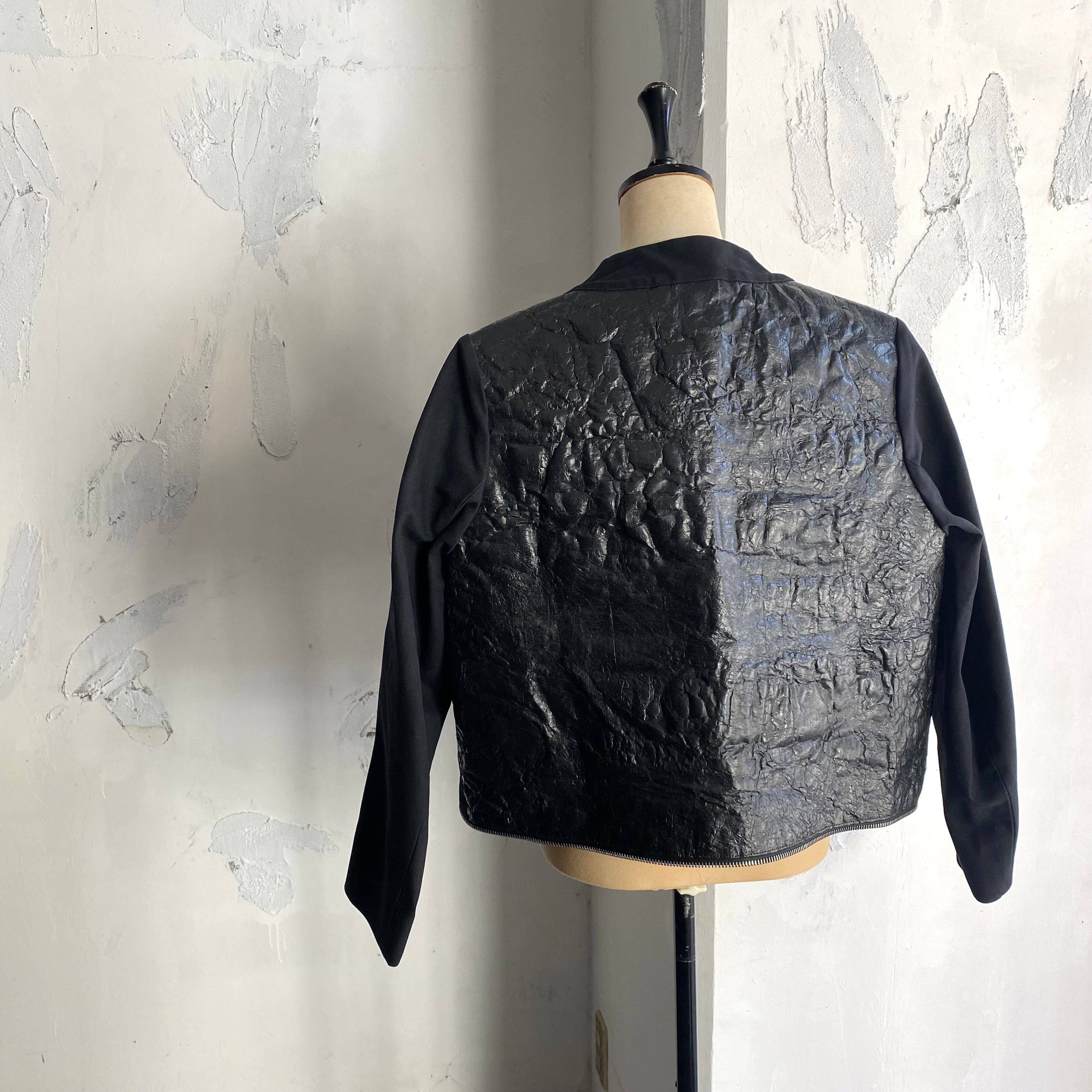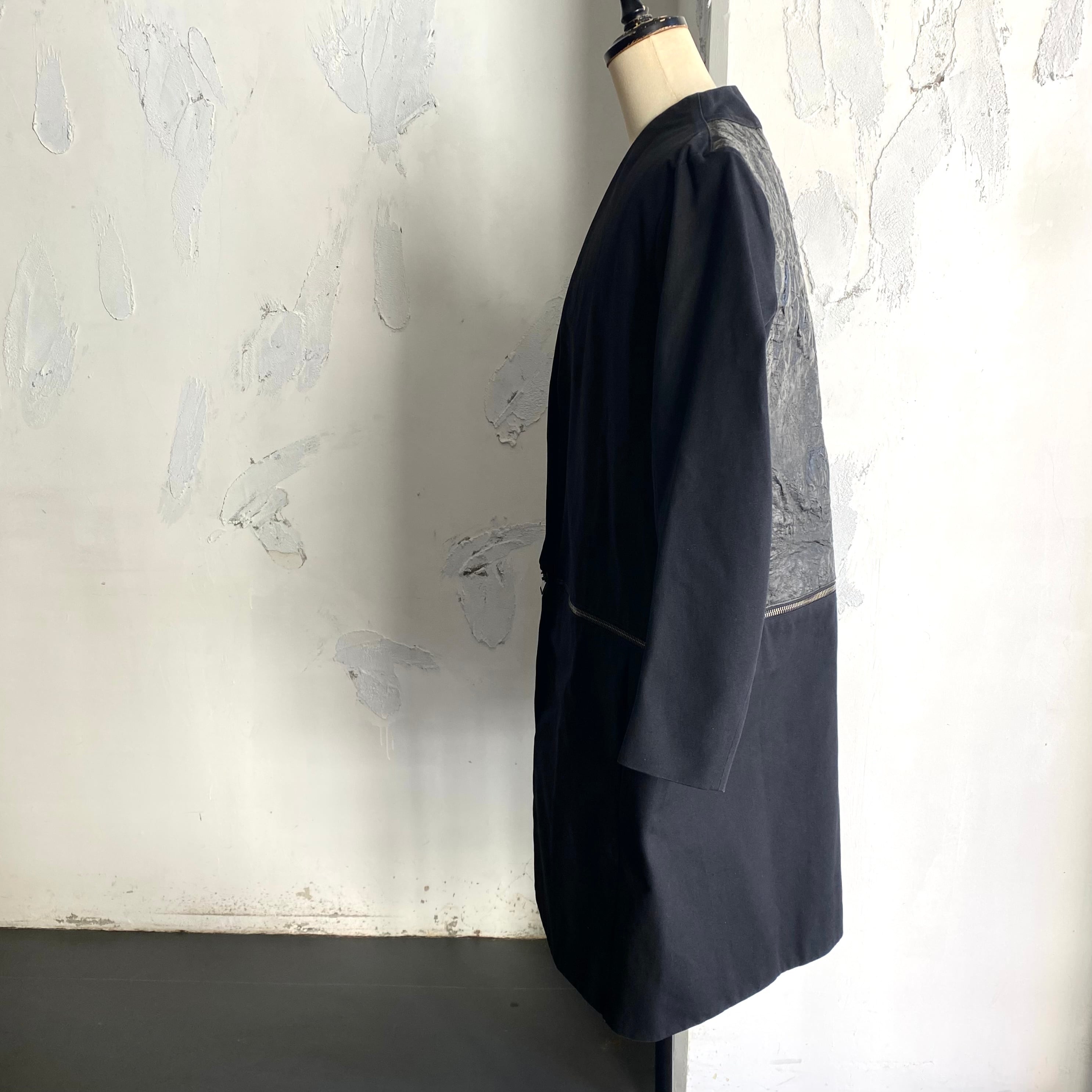 コーティング部だけではなく全体的に固い生地で、袖幅は極端に細くなっています。ワイドのコクーンフォルムで固さが織りなす立体感は彫刻的な表情で、個性的なディテールと合わさり芸術作品の様です。