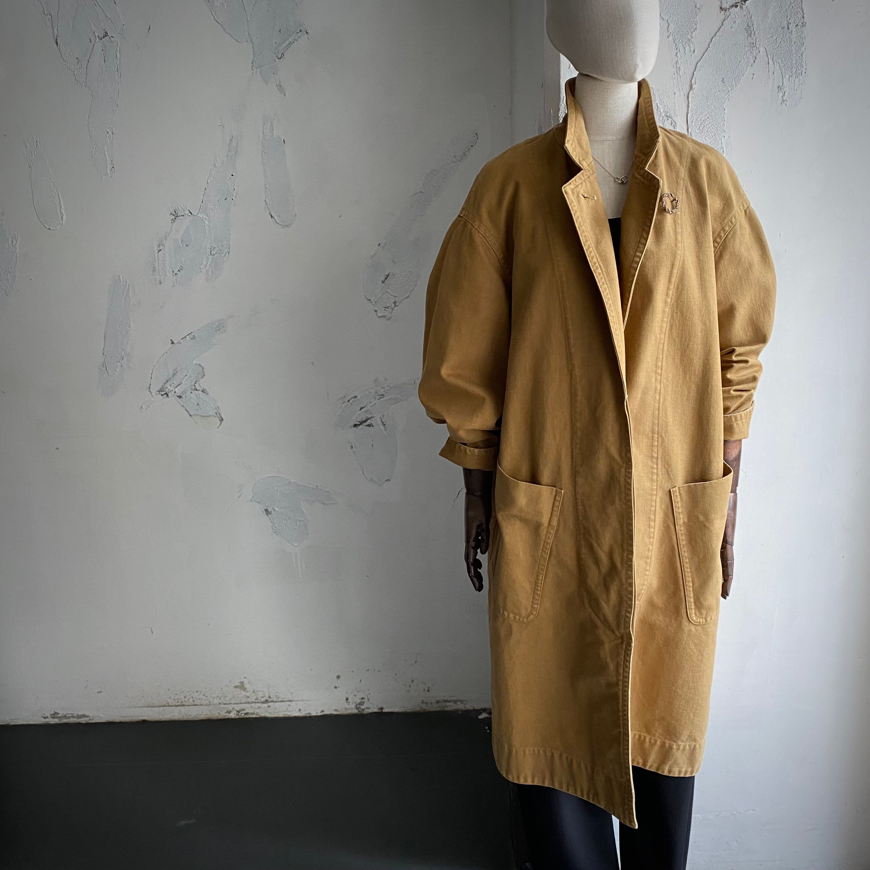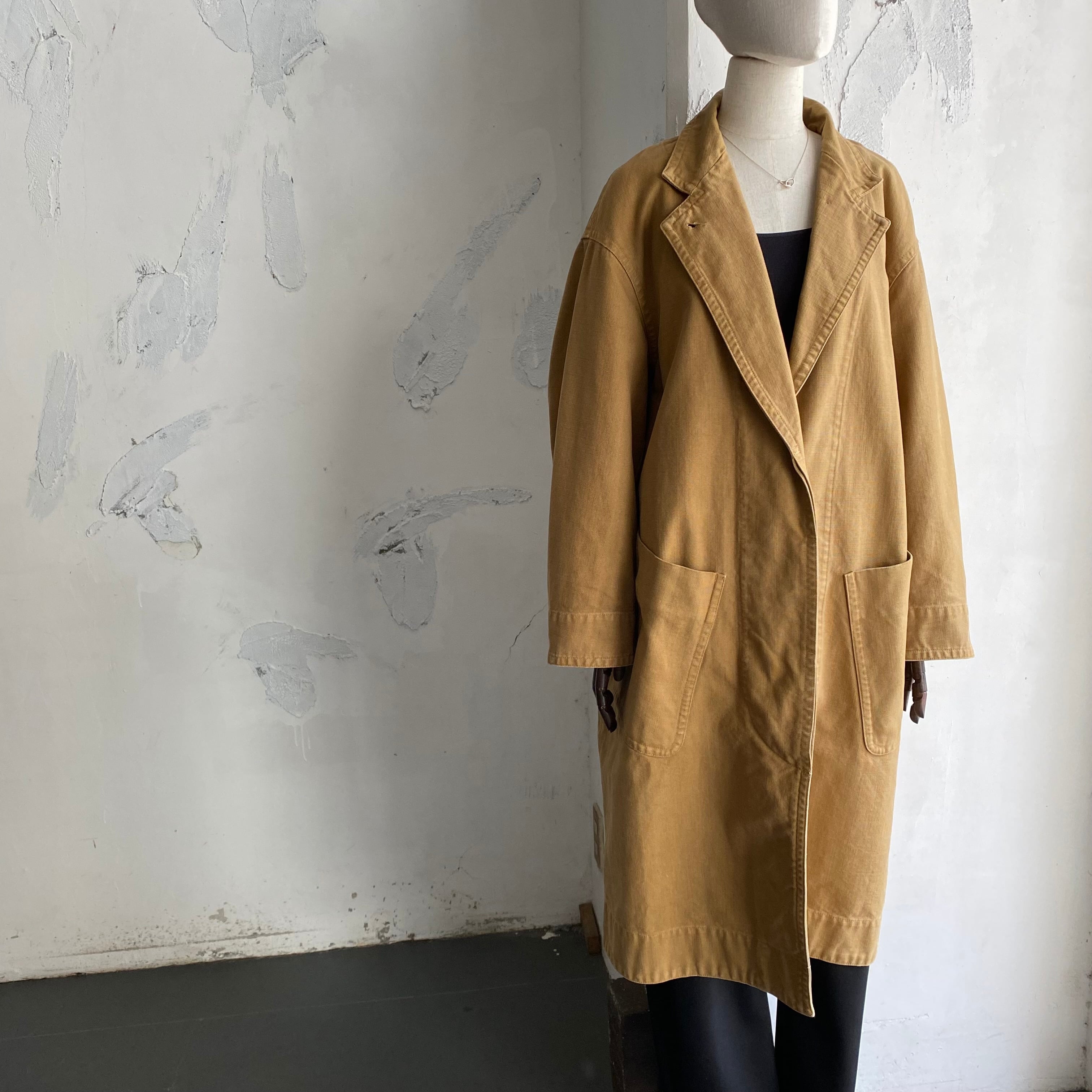 ワークテイスト漂う黄土色のダック生地。生地のハリがリラックスフォルムの立体感を綺麗に演出していて、雰囲気の良いコートです。