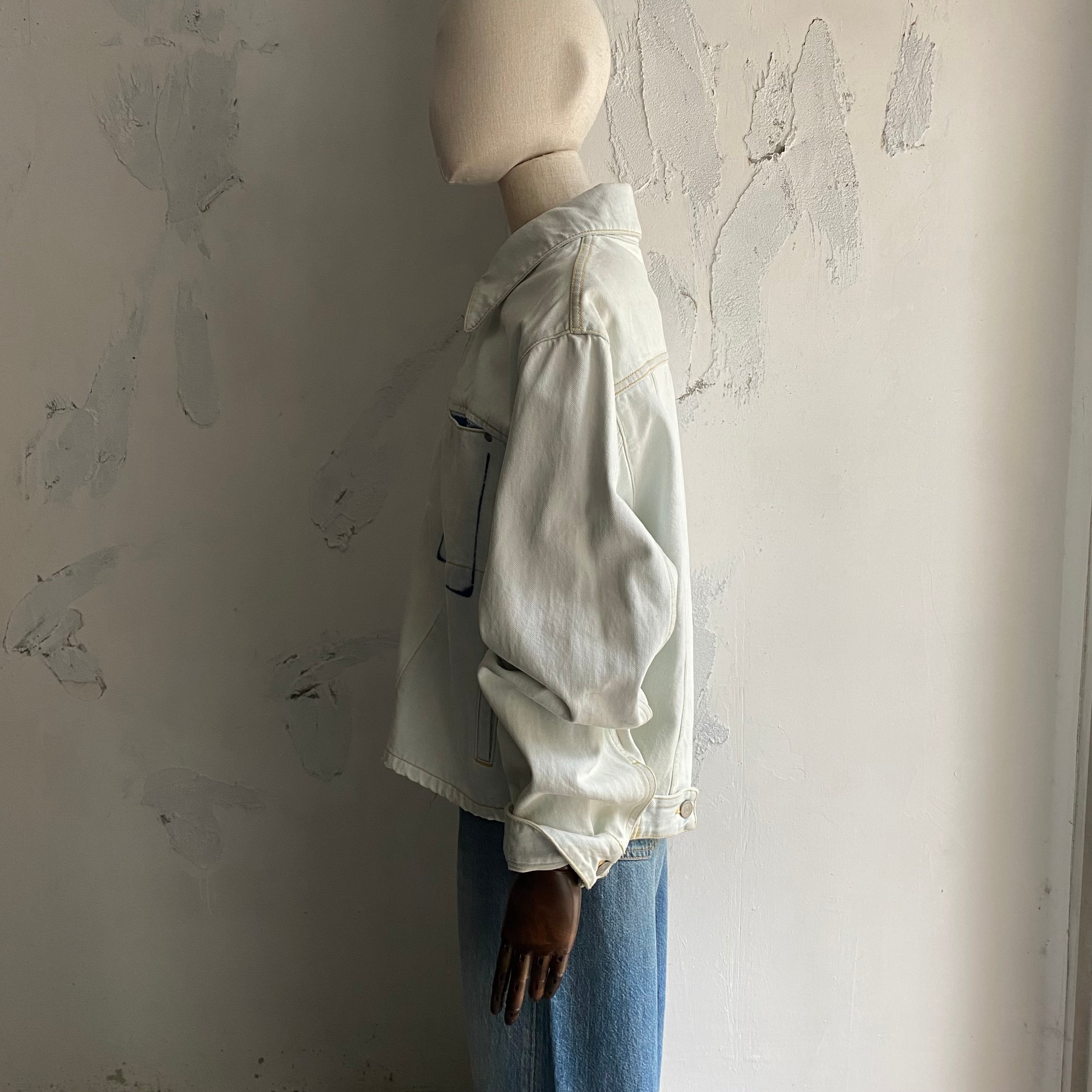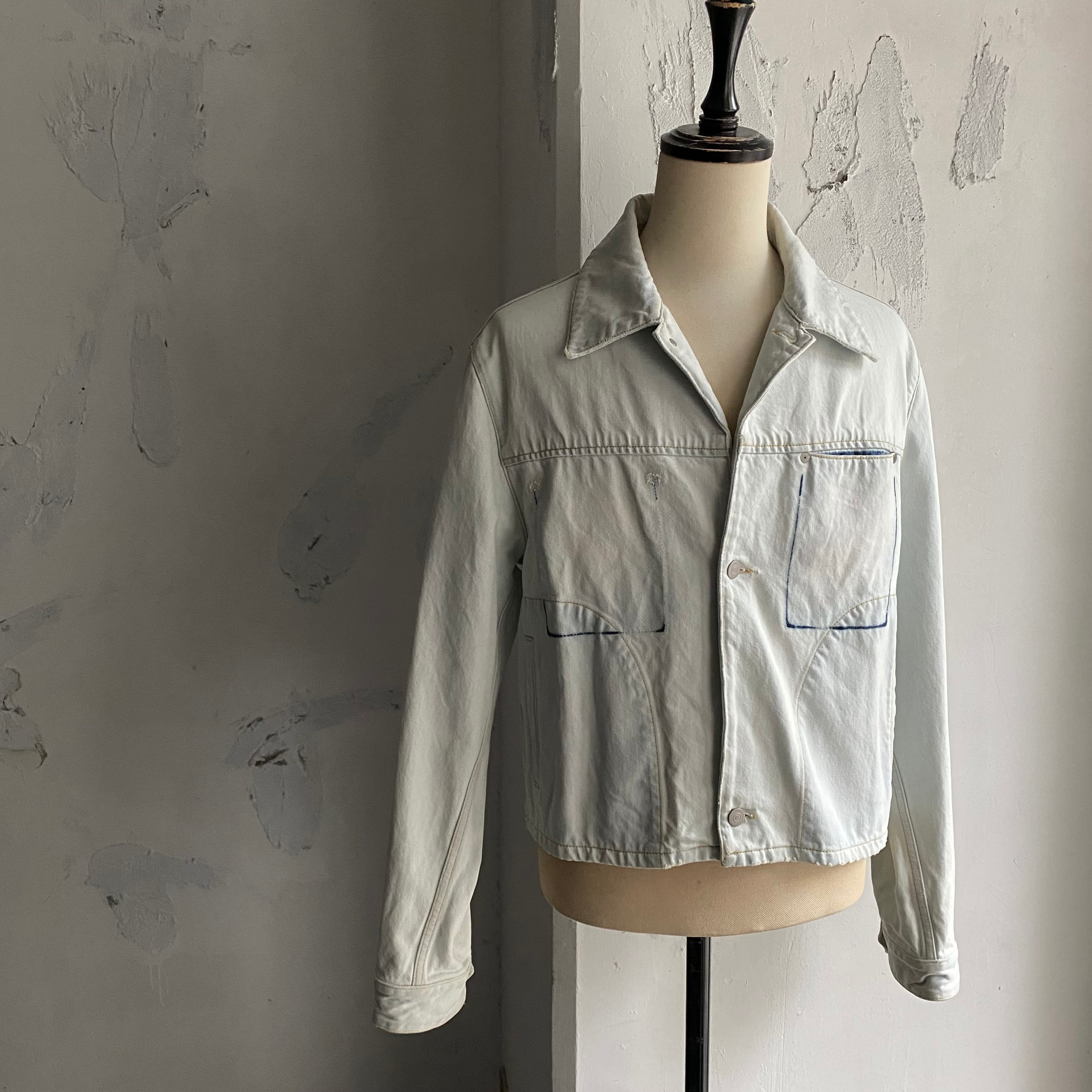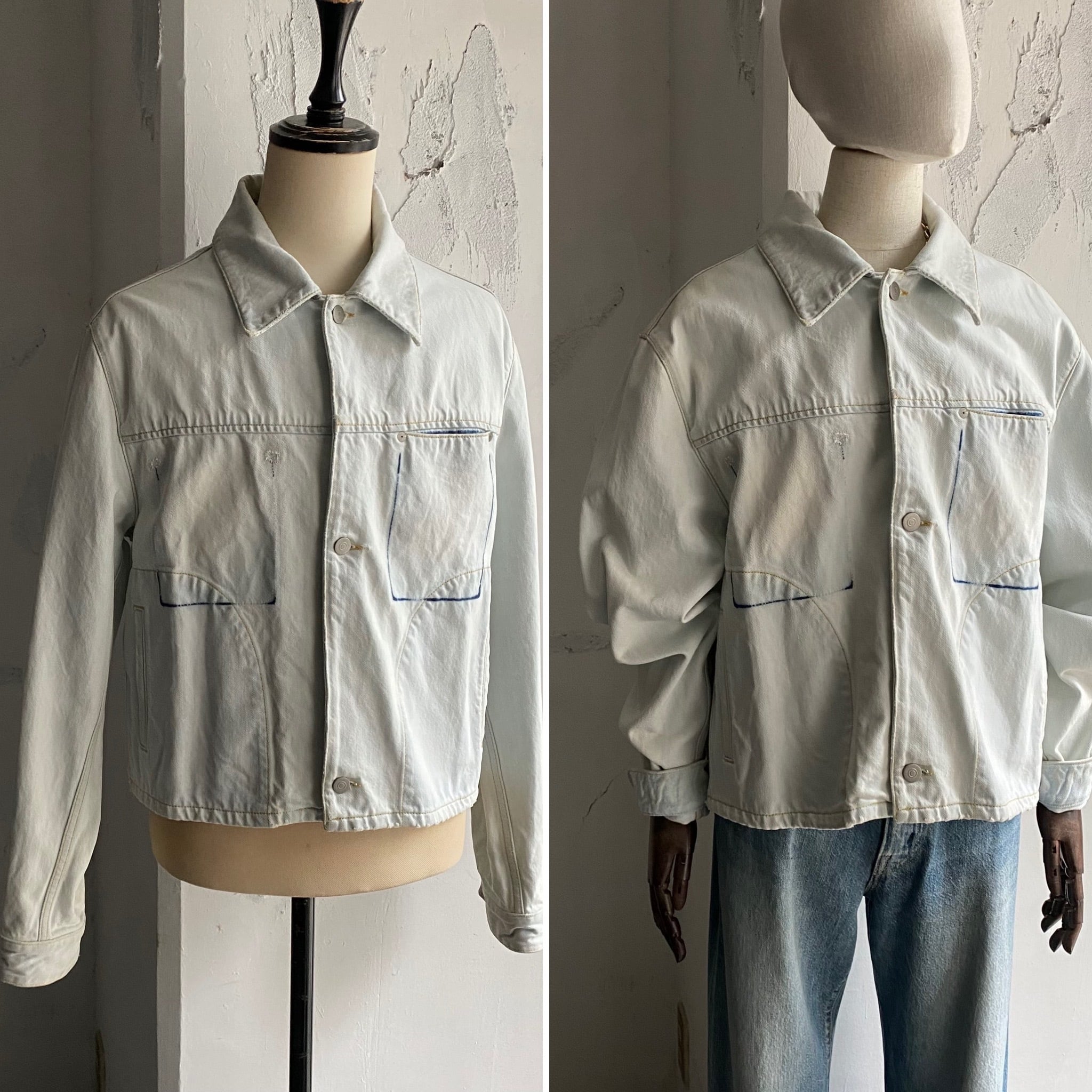 ブリーチをしてアイスブルーに仕上げたジャケット。リペアやアタリ、薄っすらとした汚れなどヴィンテージ加工も秀逸で、胸ポケットのインディゴ残りが個性をプラスしています。
