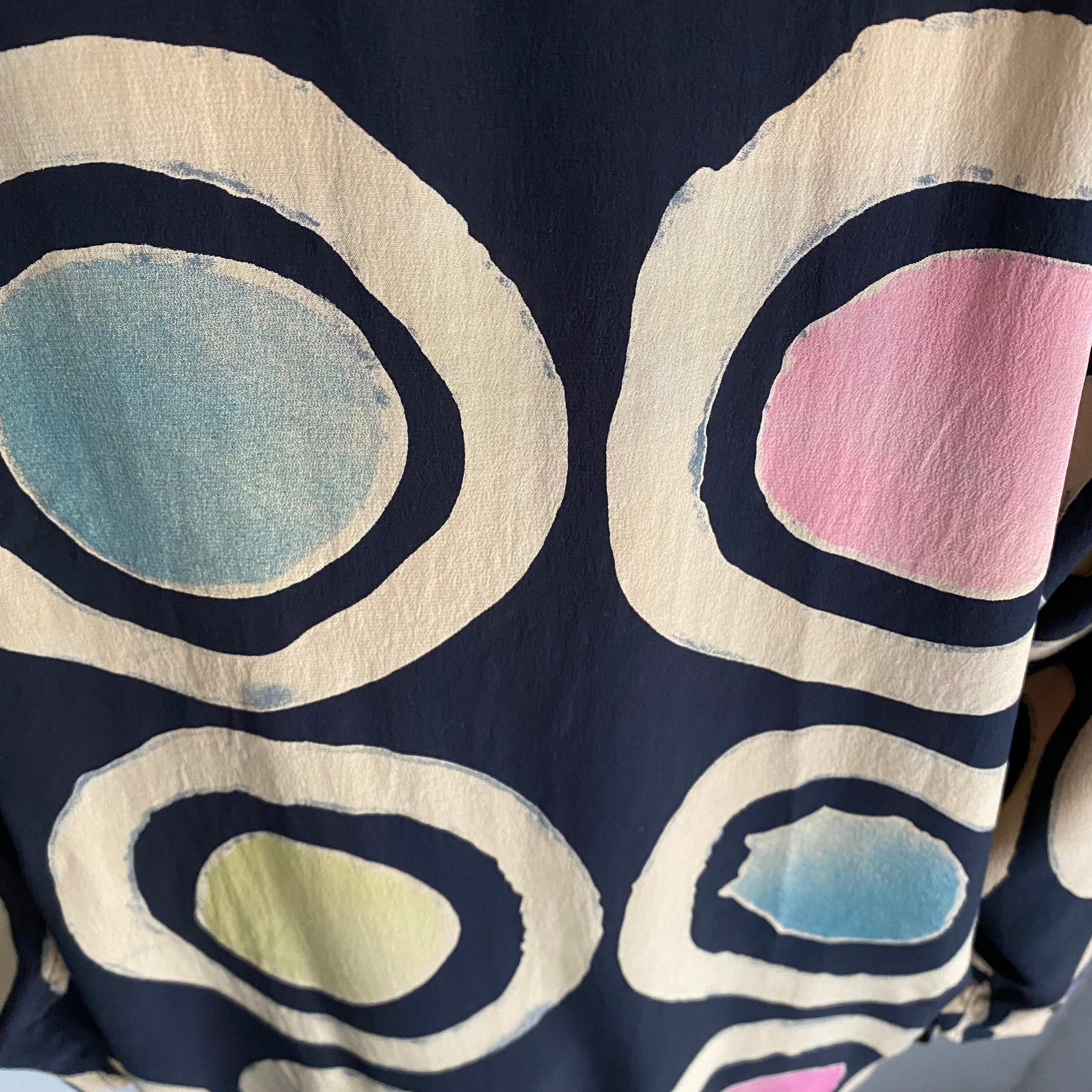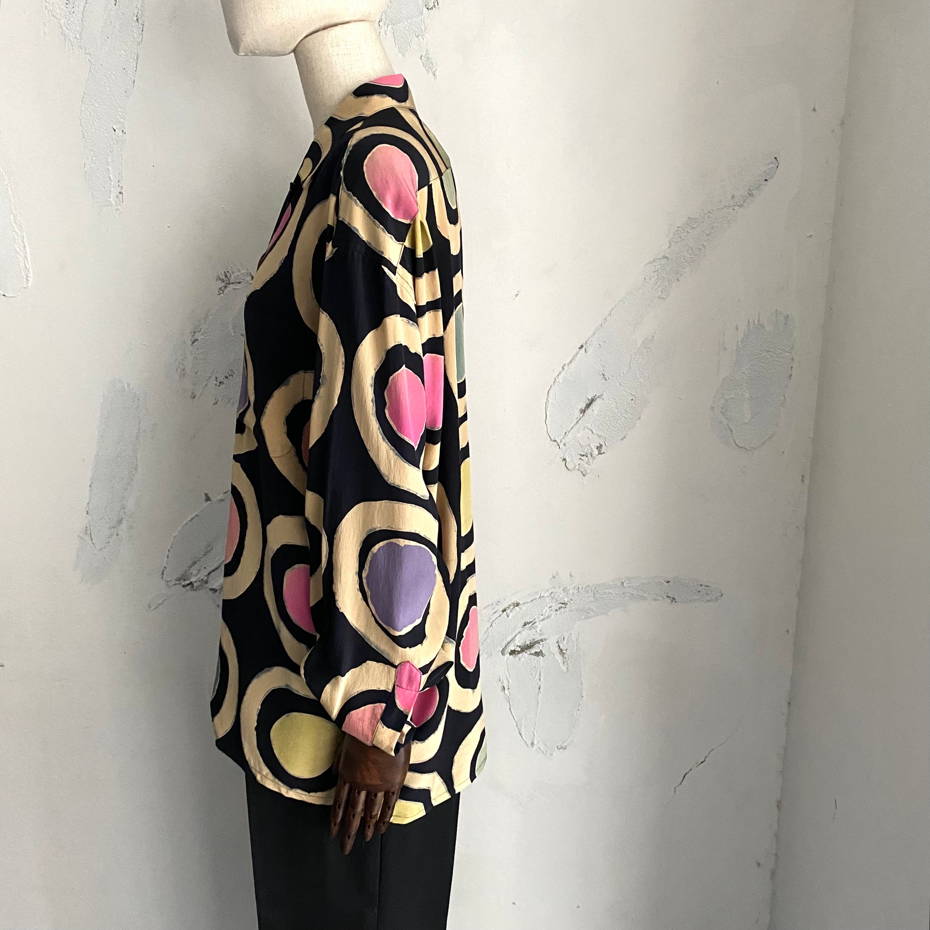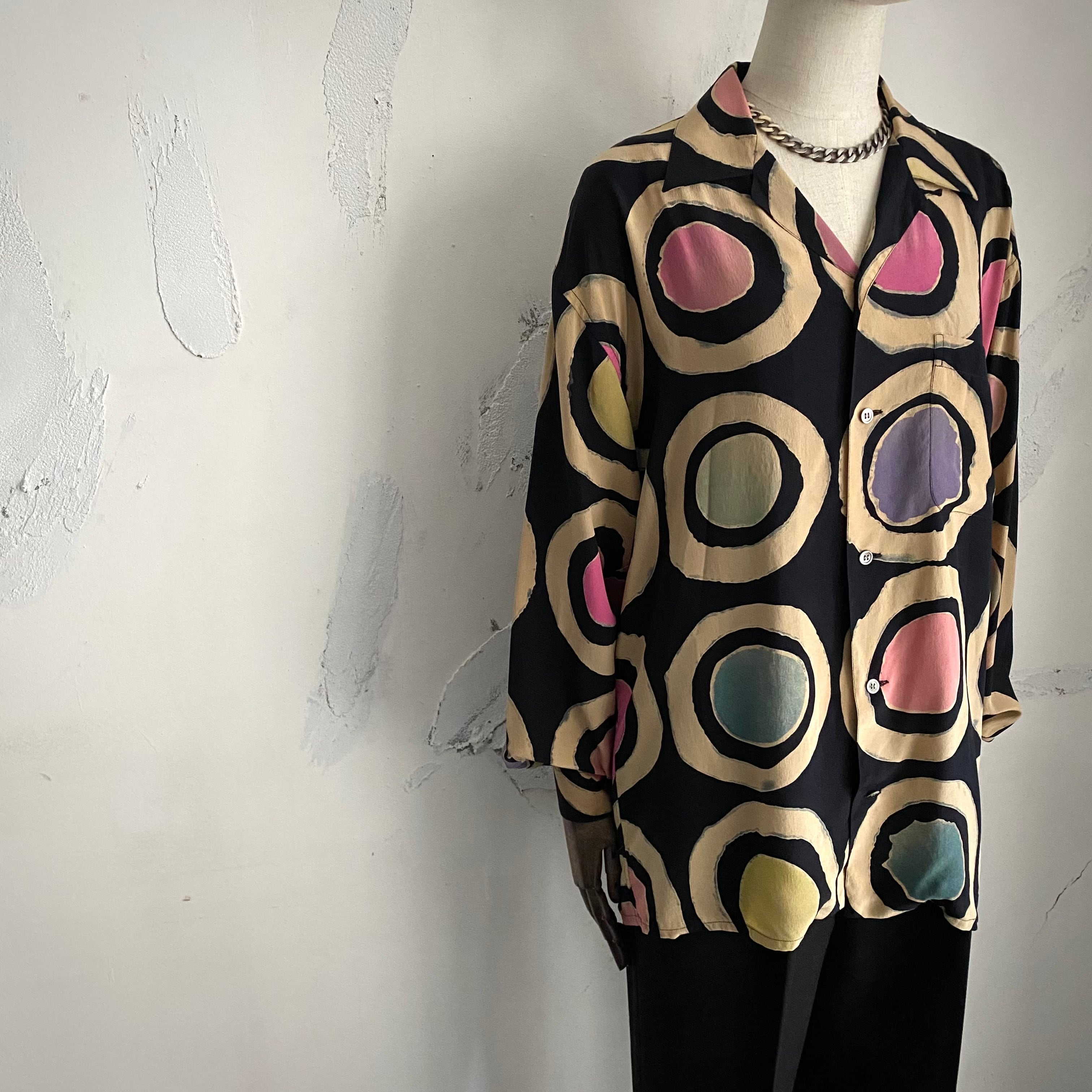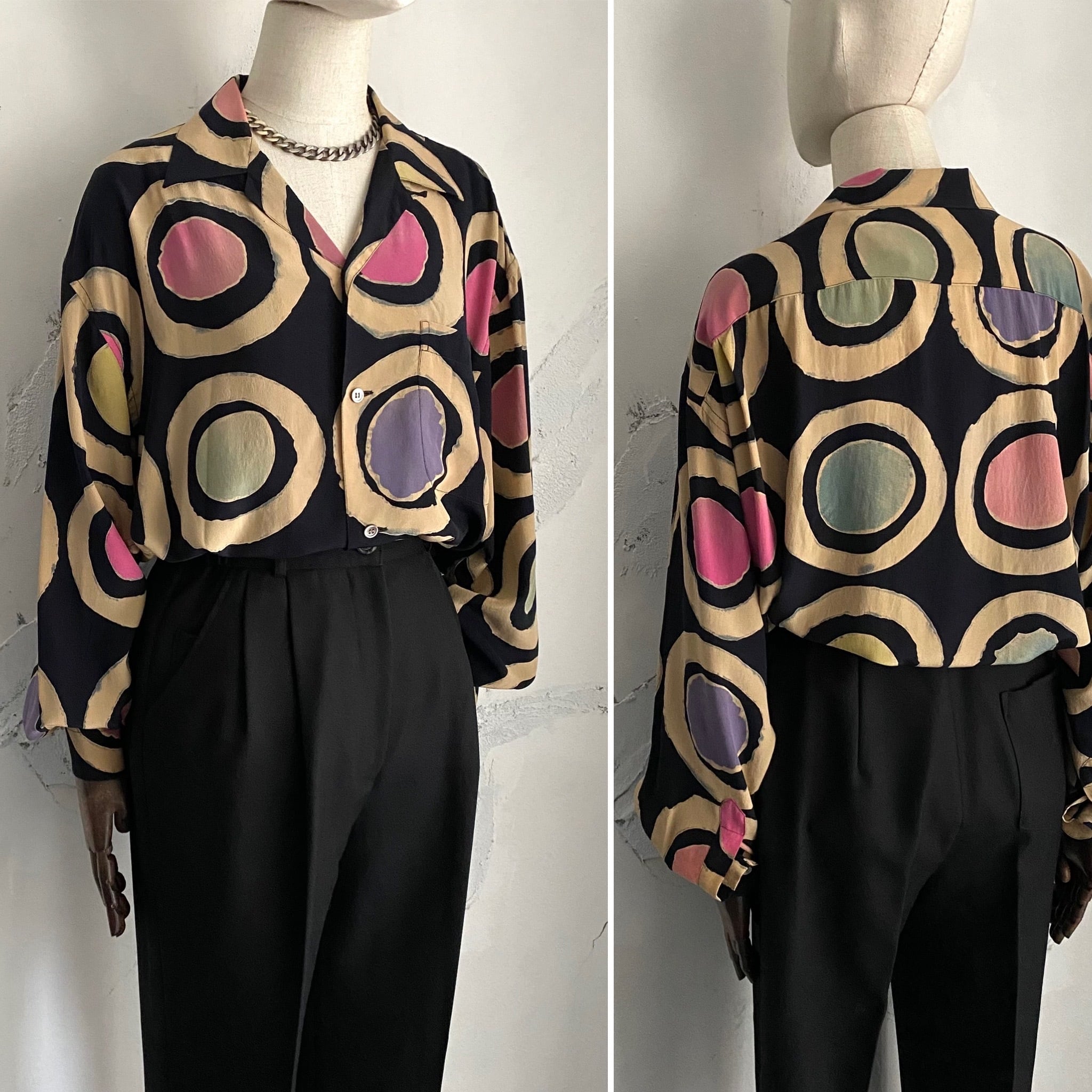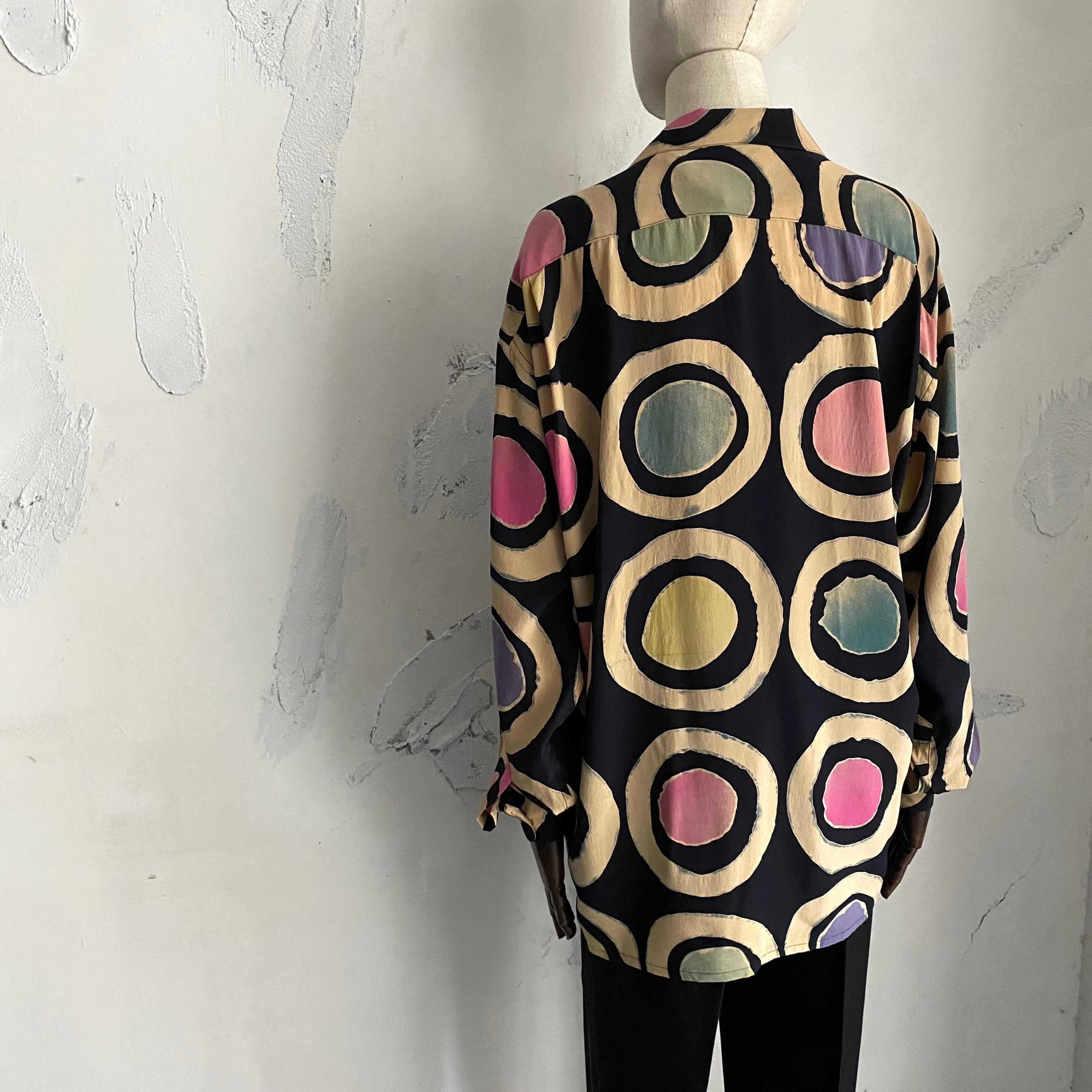 まるでピータンの様なハンドドローイングのポップパターンが印象的です。シルクの梨地が優美なドレイプを作っていて、クラシックでアダルトなブラウス。