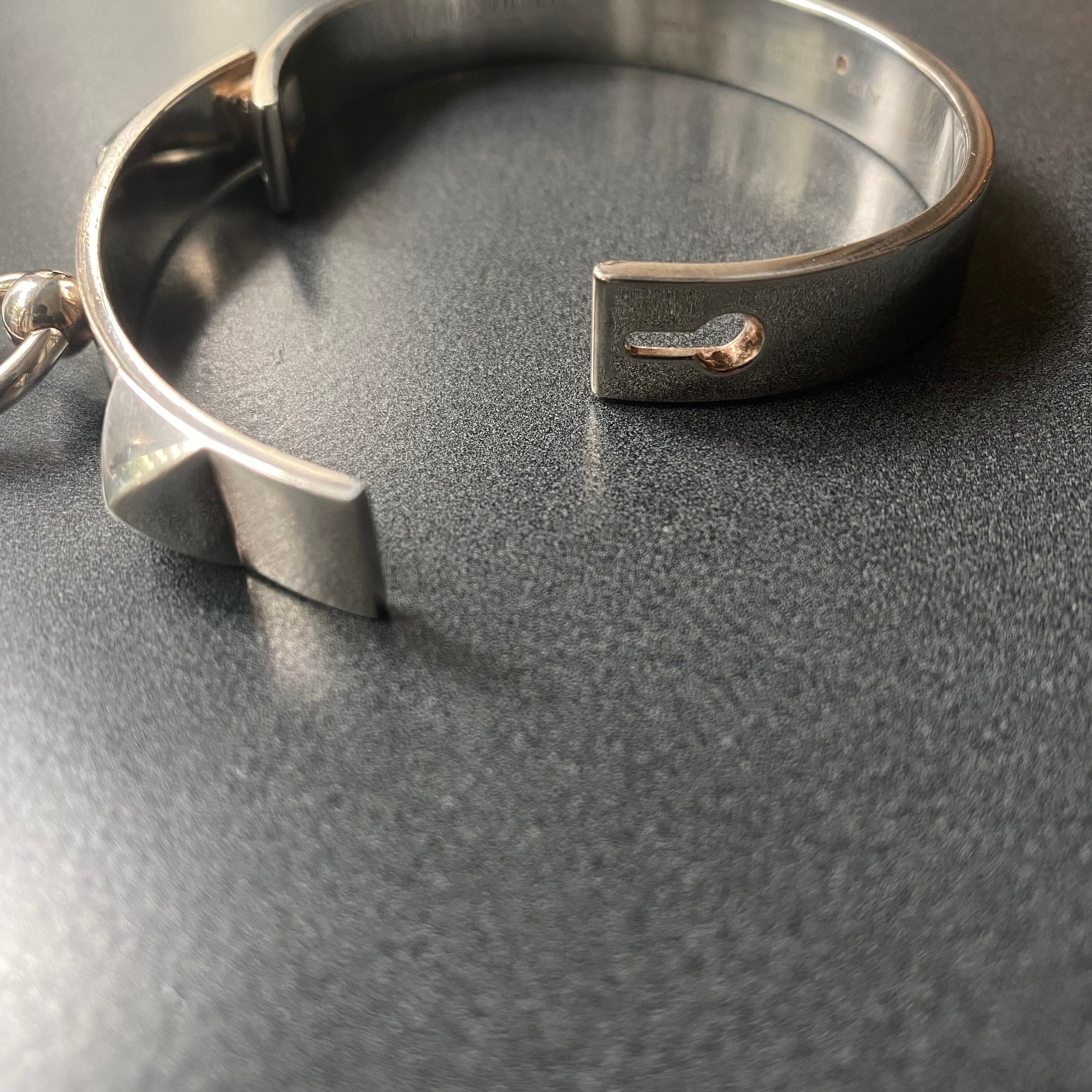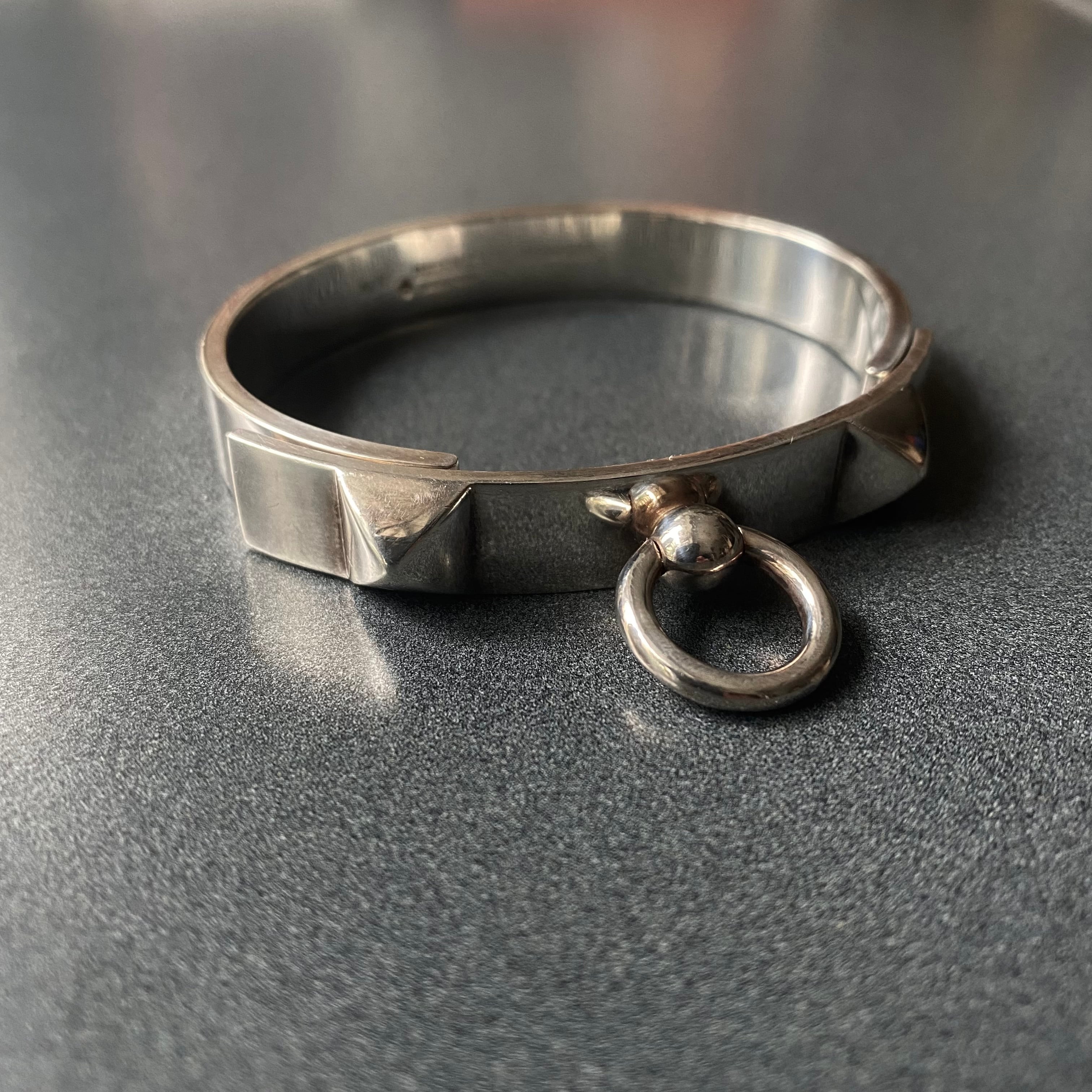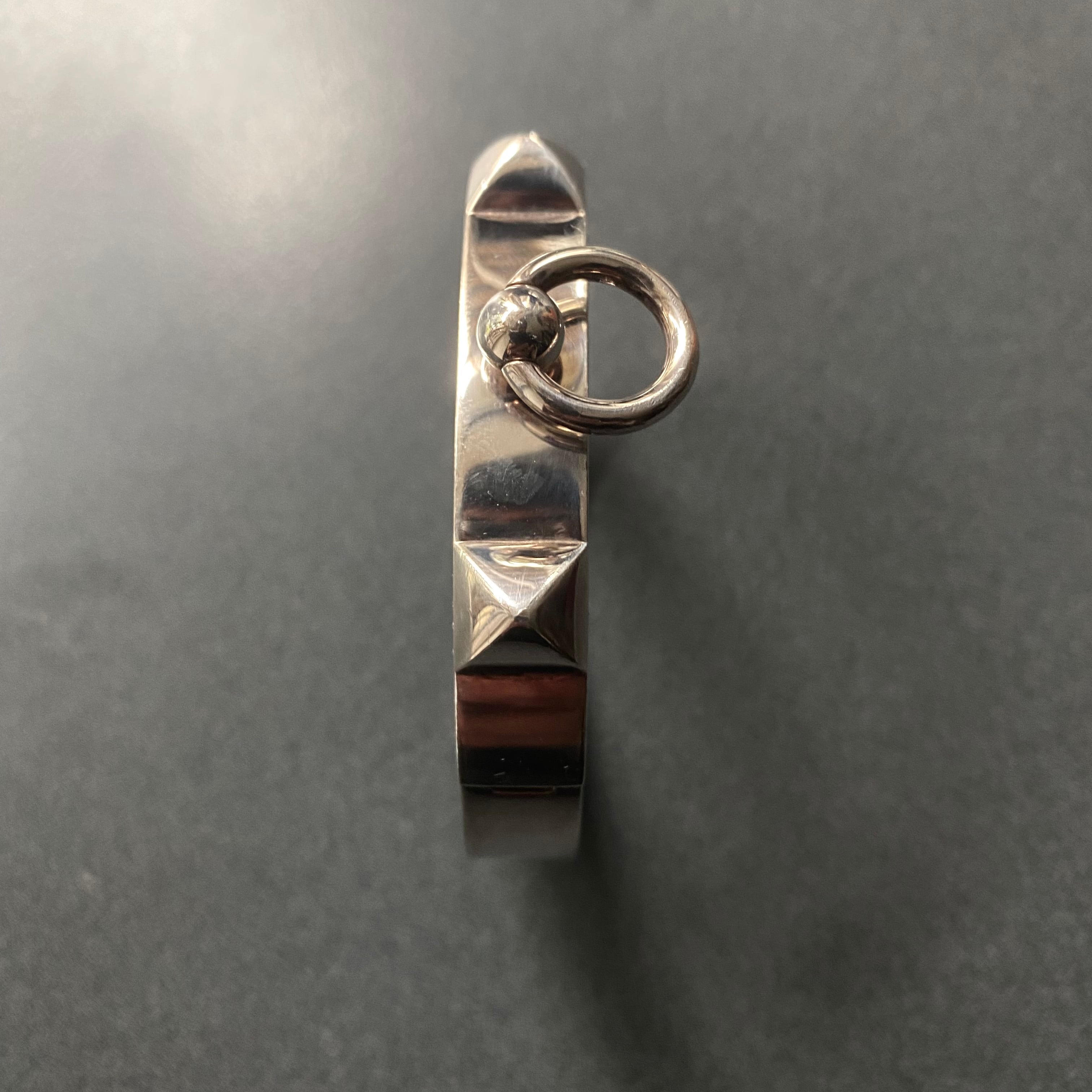 ピラミッドスタッズのメドールとリングをあしらったデザインは、シャープな質感とボリュームが魅力。