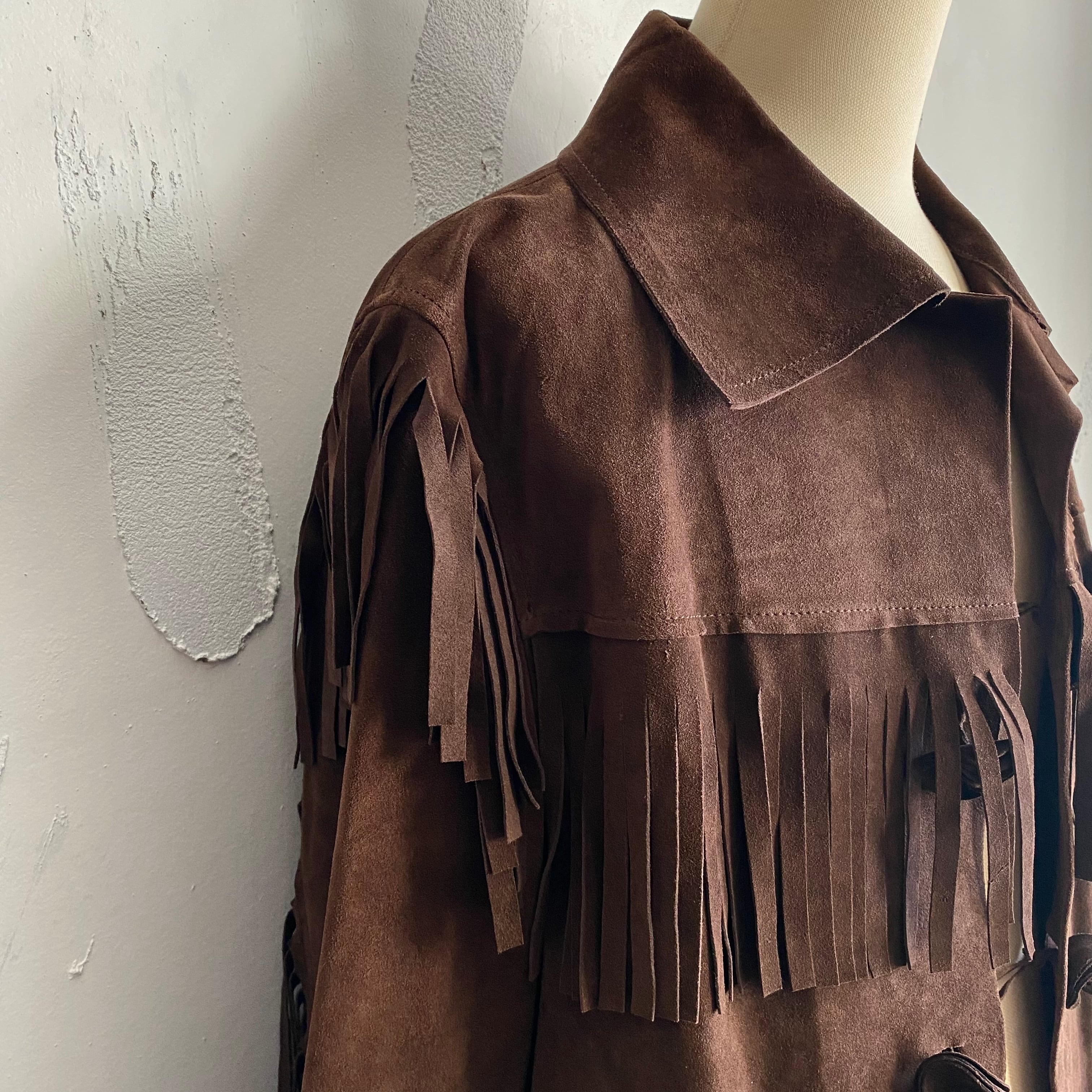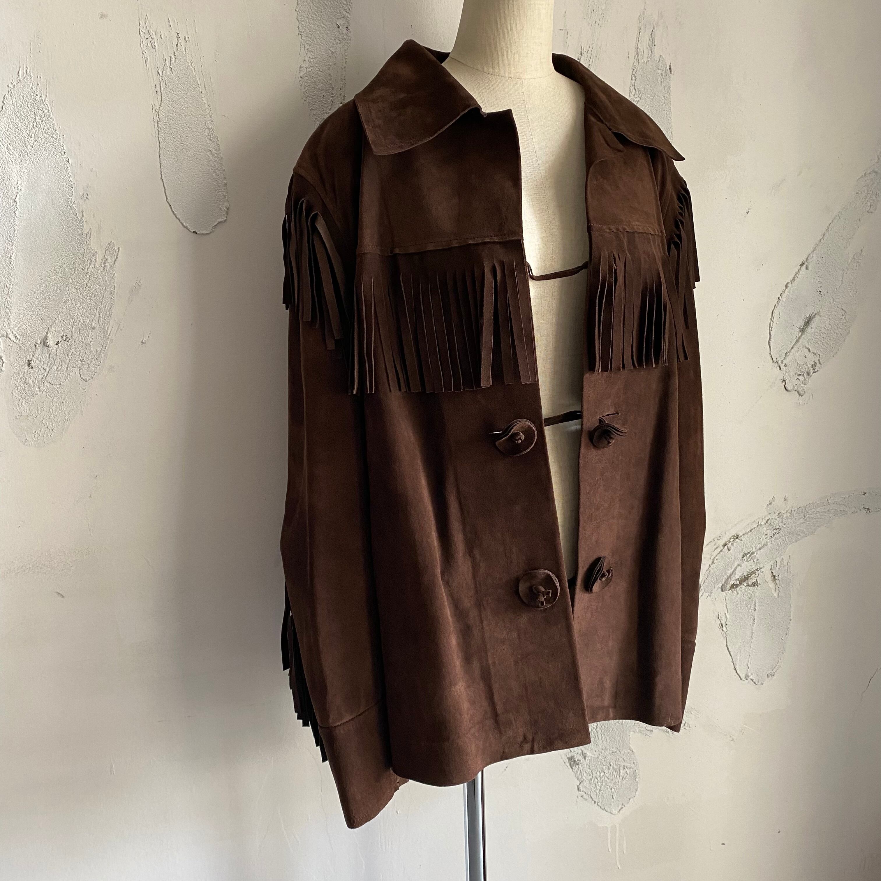 毛足の短いハリのある牛革スエードにフリンジが施されたフォークロア調のジャケット。