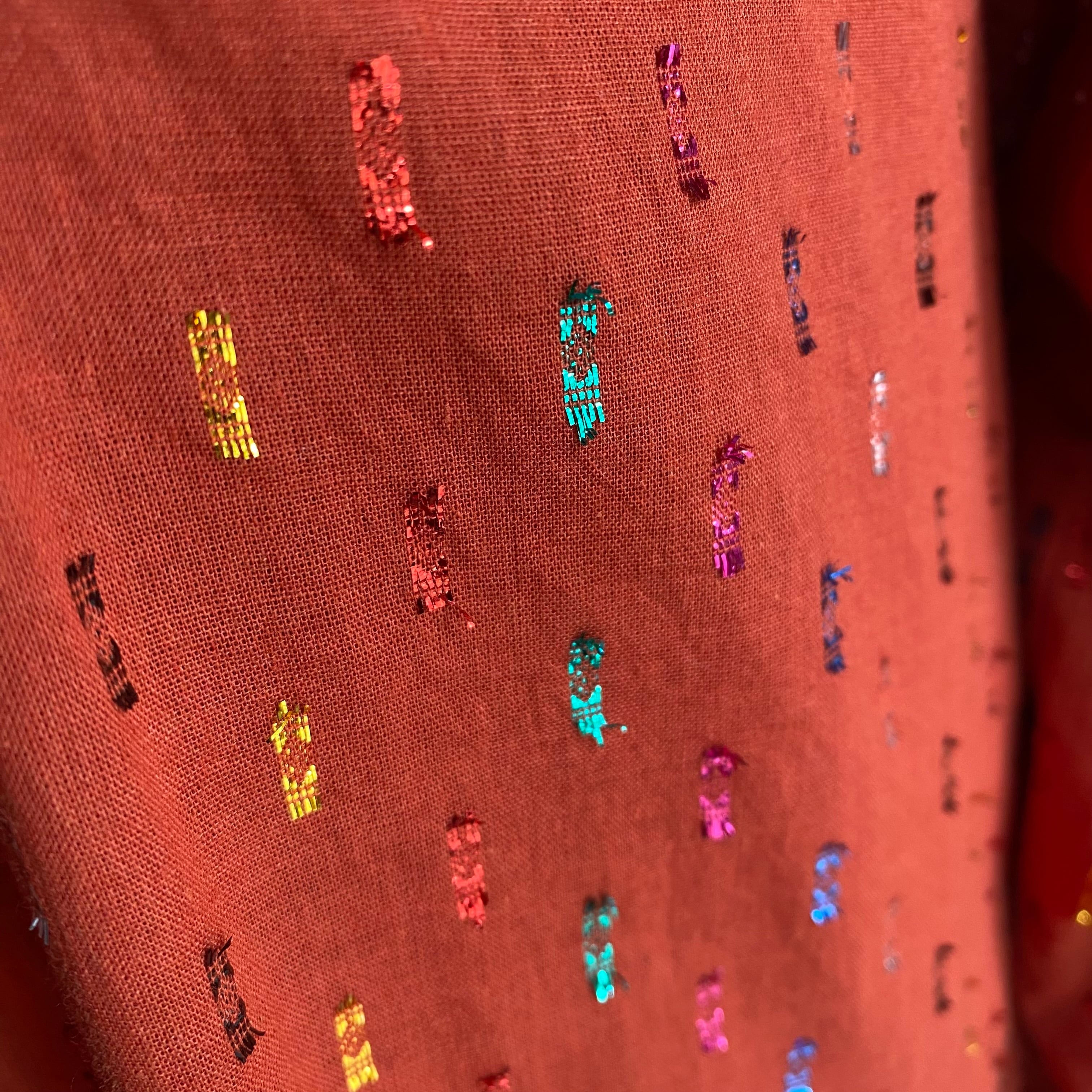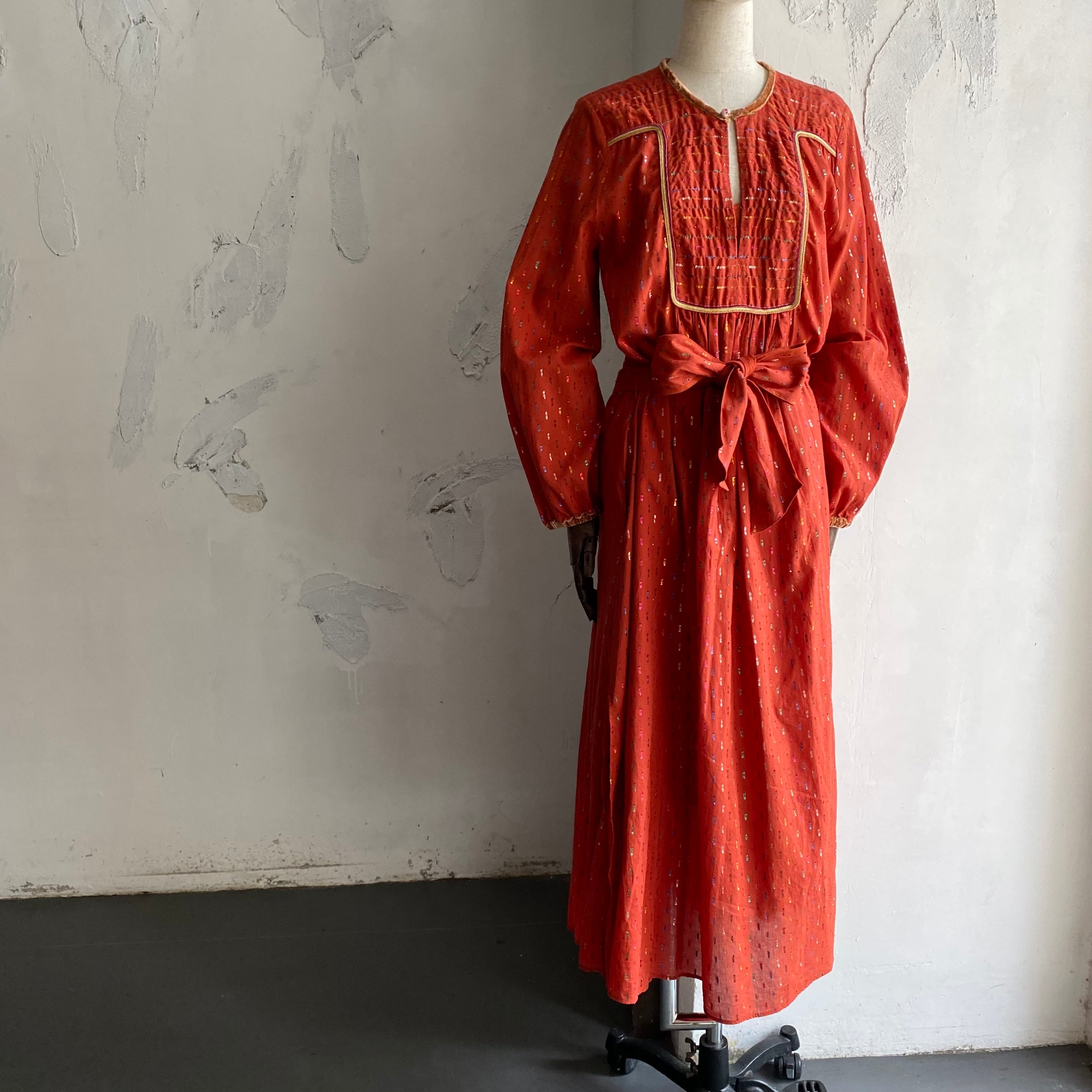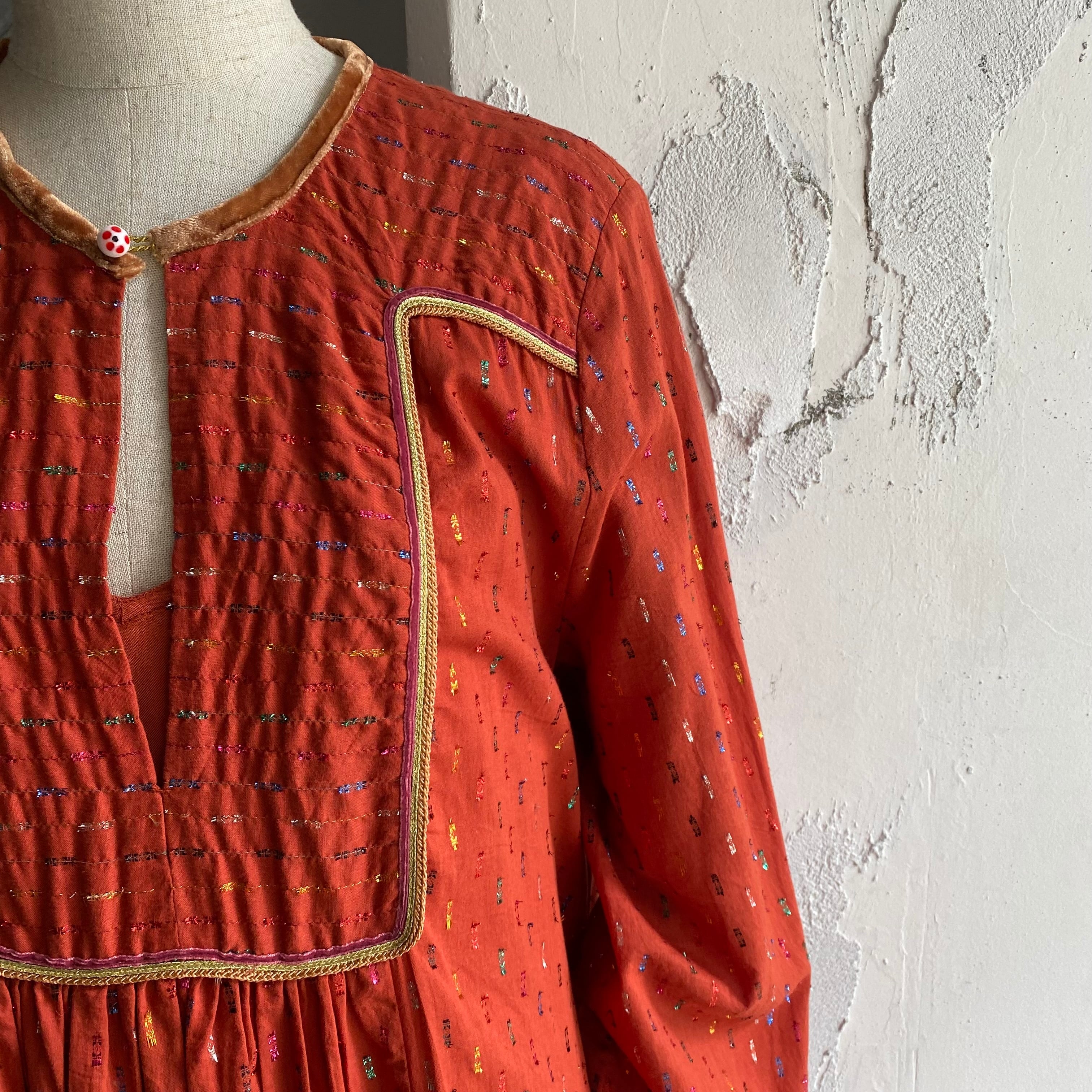 ダークオレンジにキラキラカラフルなレクタングルドットを施したテクニカルな生地。袖口、襟のベロアと3種類のテープを使ったフロントのパイピング。ネック留めの愛らしいビーズ。形はややナローなコンサバフォルムのロング丈。お好みでベルトアクセントを。